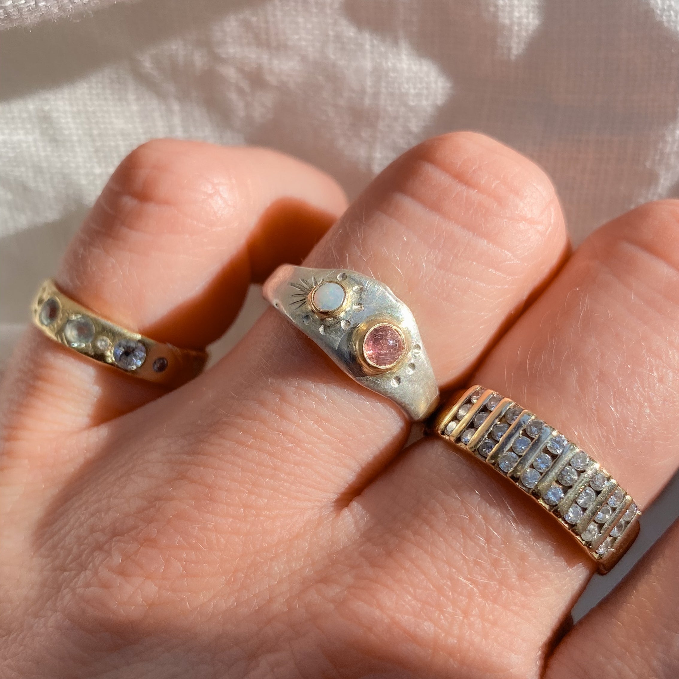 A funky, asymmetrical take on the classic signet. Customized to your preference with any metal or gemstones of your choice.