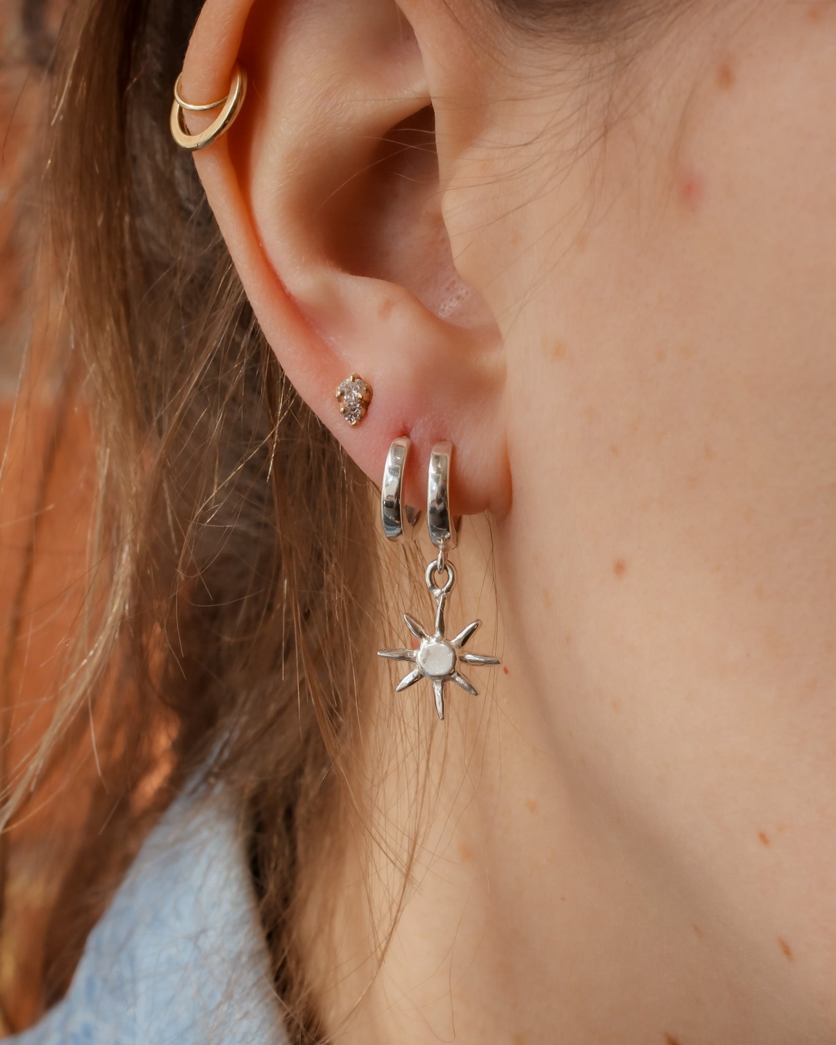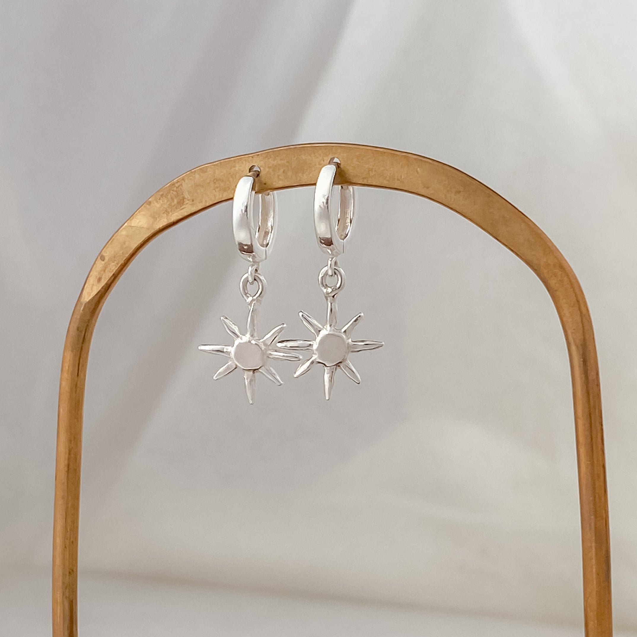 A sterling silver sun charm hangs from a hinge style hoop. Lightweight and comfortable for all day wear.