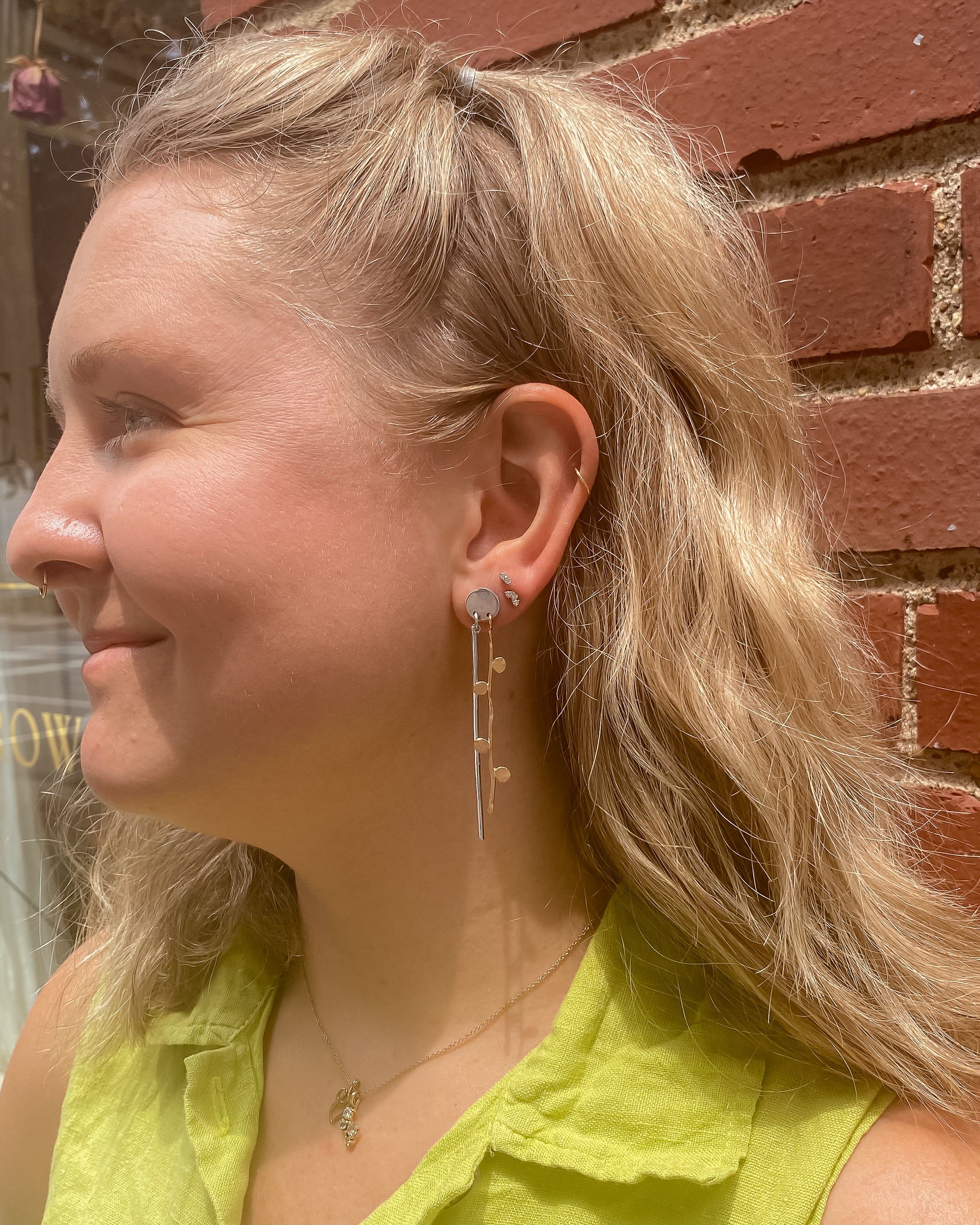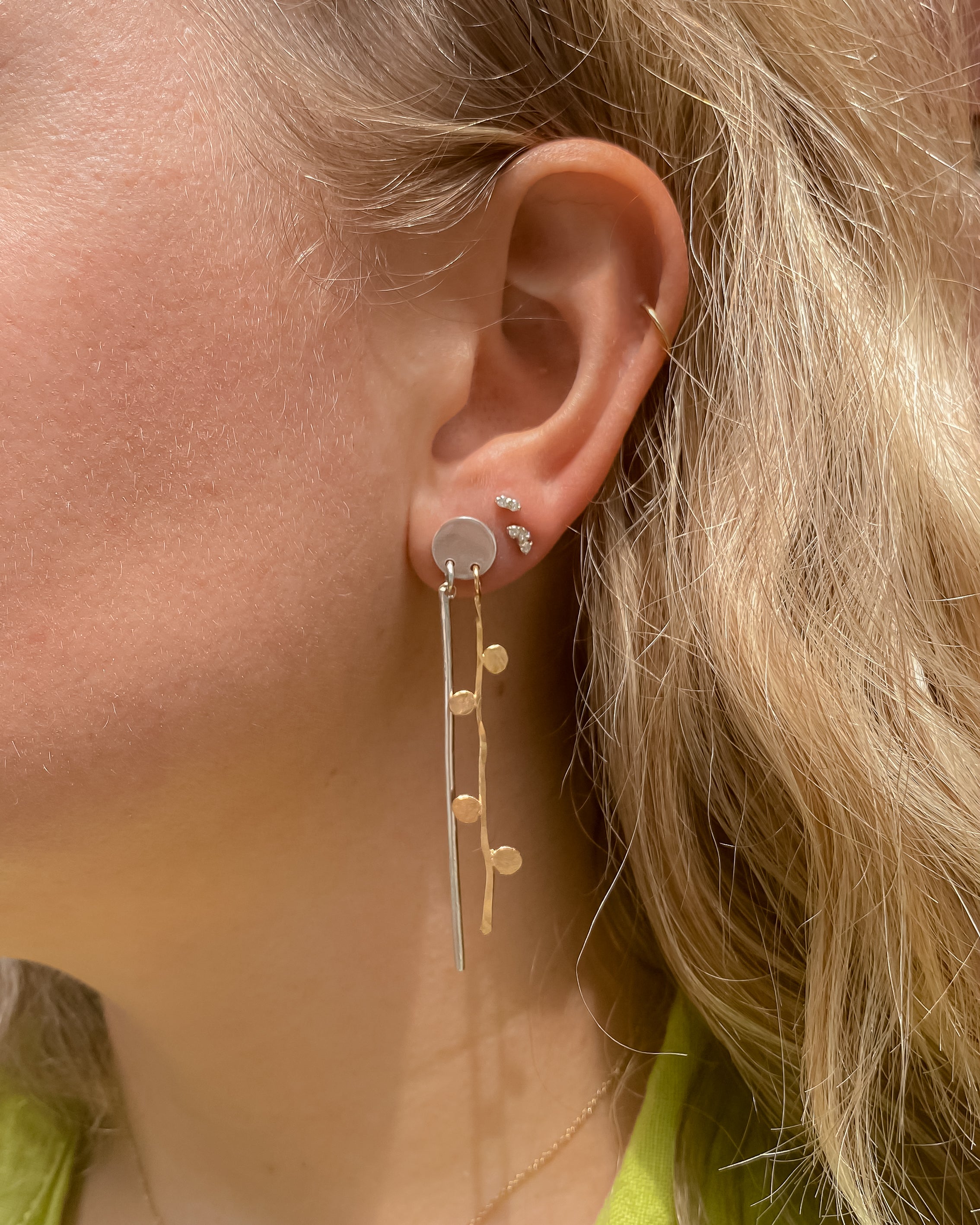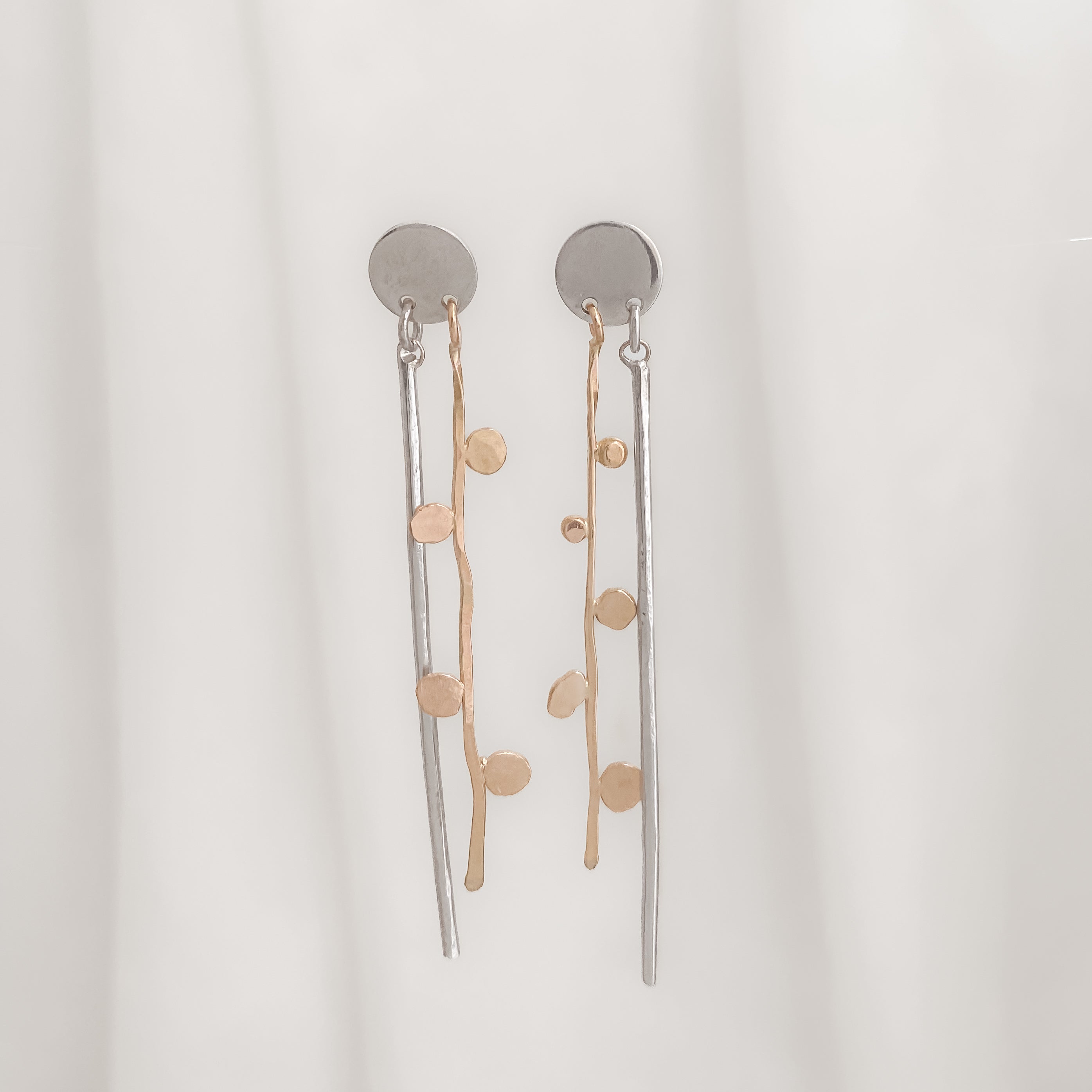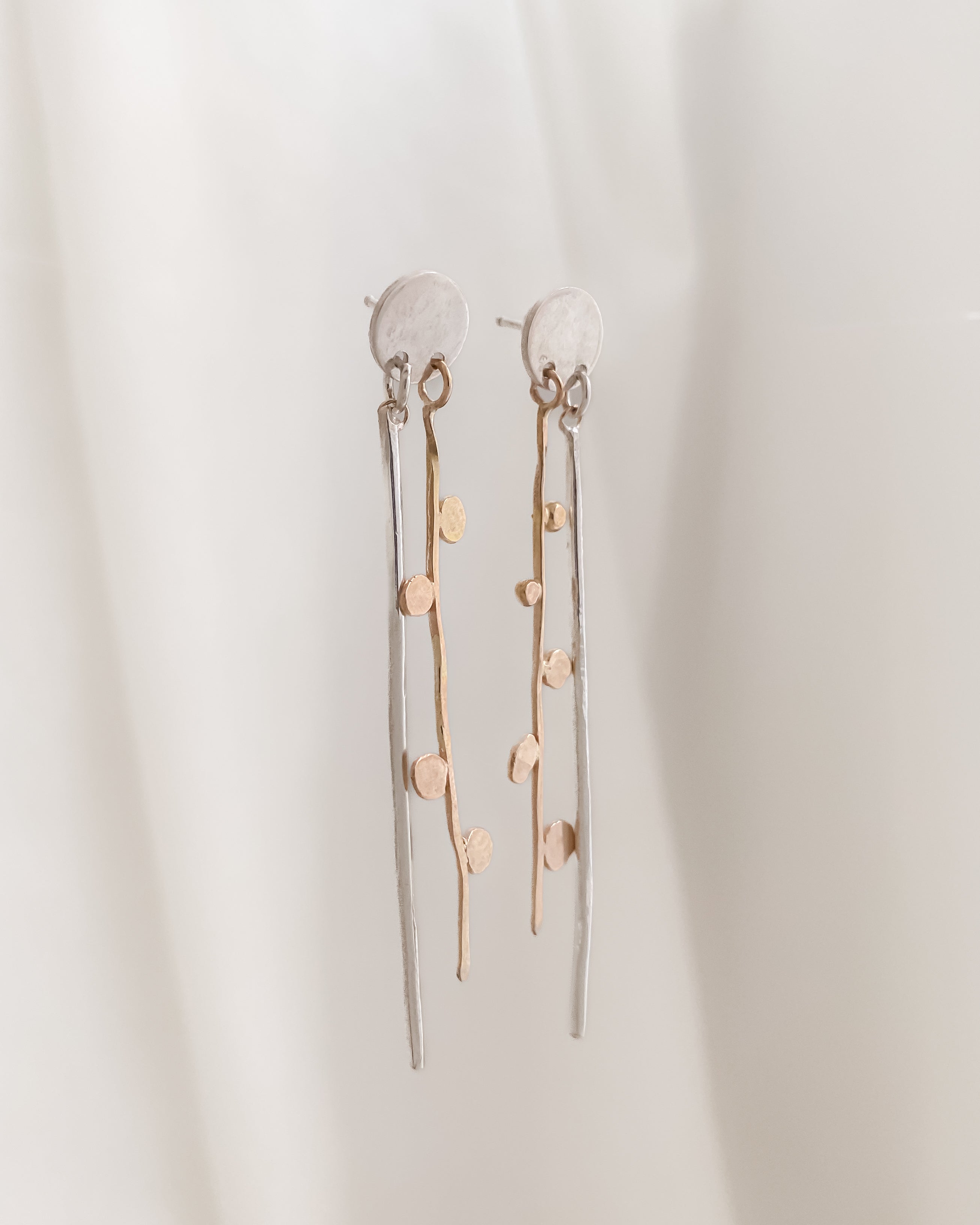 Crafted from reclaimed 14k gold and sterling silver, the Jolie Mixed Metal Earrings are a Lackadazee original. The stud design allows for comfortable wear while the attached bars create beautiful movement.