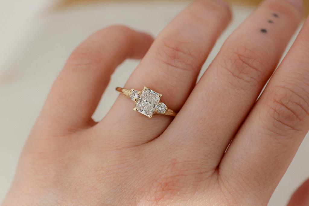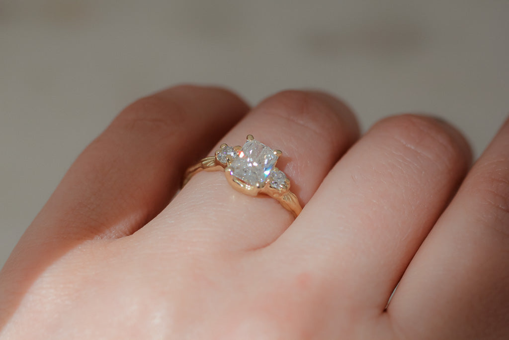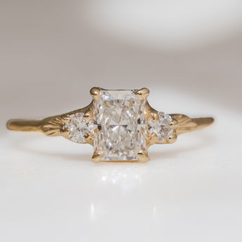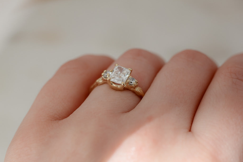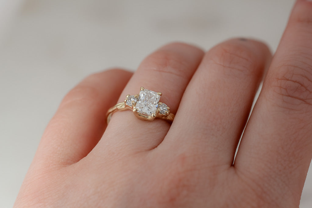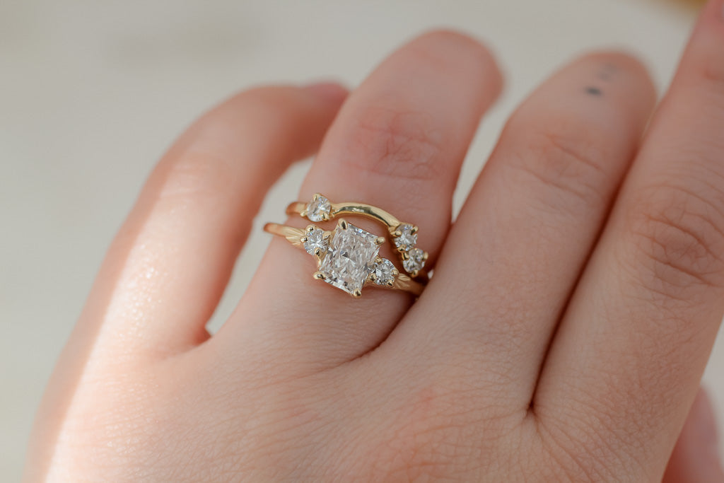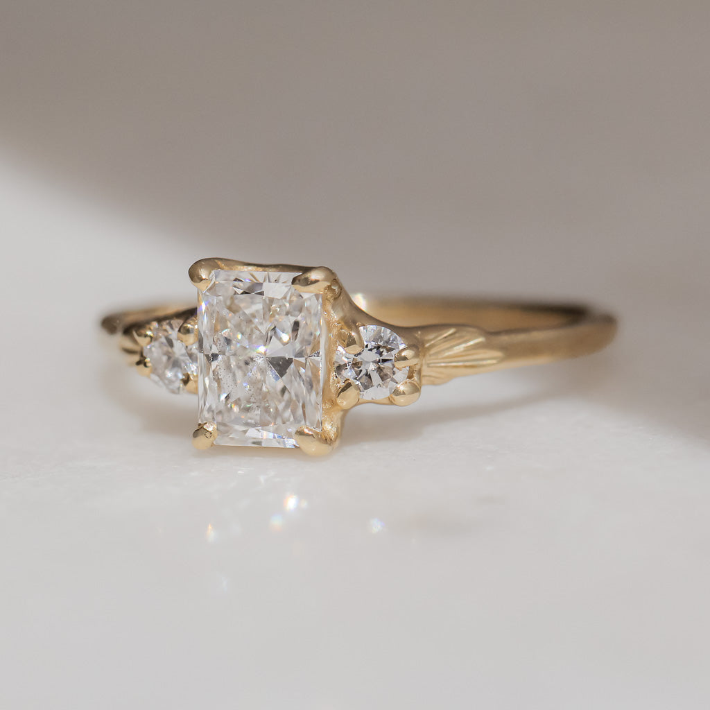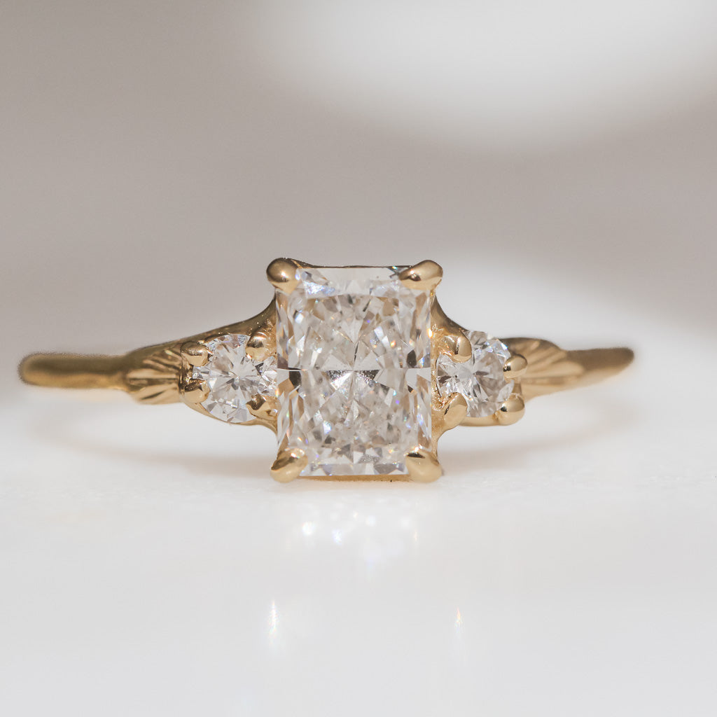 An absolutely timeless beauty, the Estate Ring is a breath from the past with hand engraved bursts elongating the band, modernized by a rectangle radiant cut center stone. This piece can be set with an emerald cut, enquire for more details.