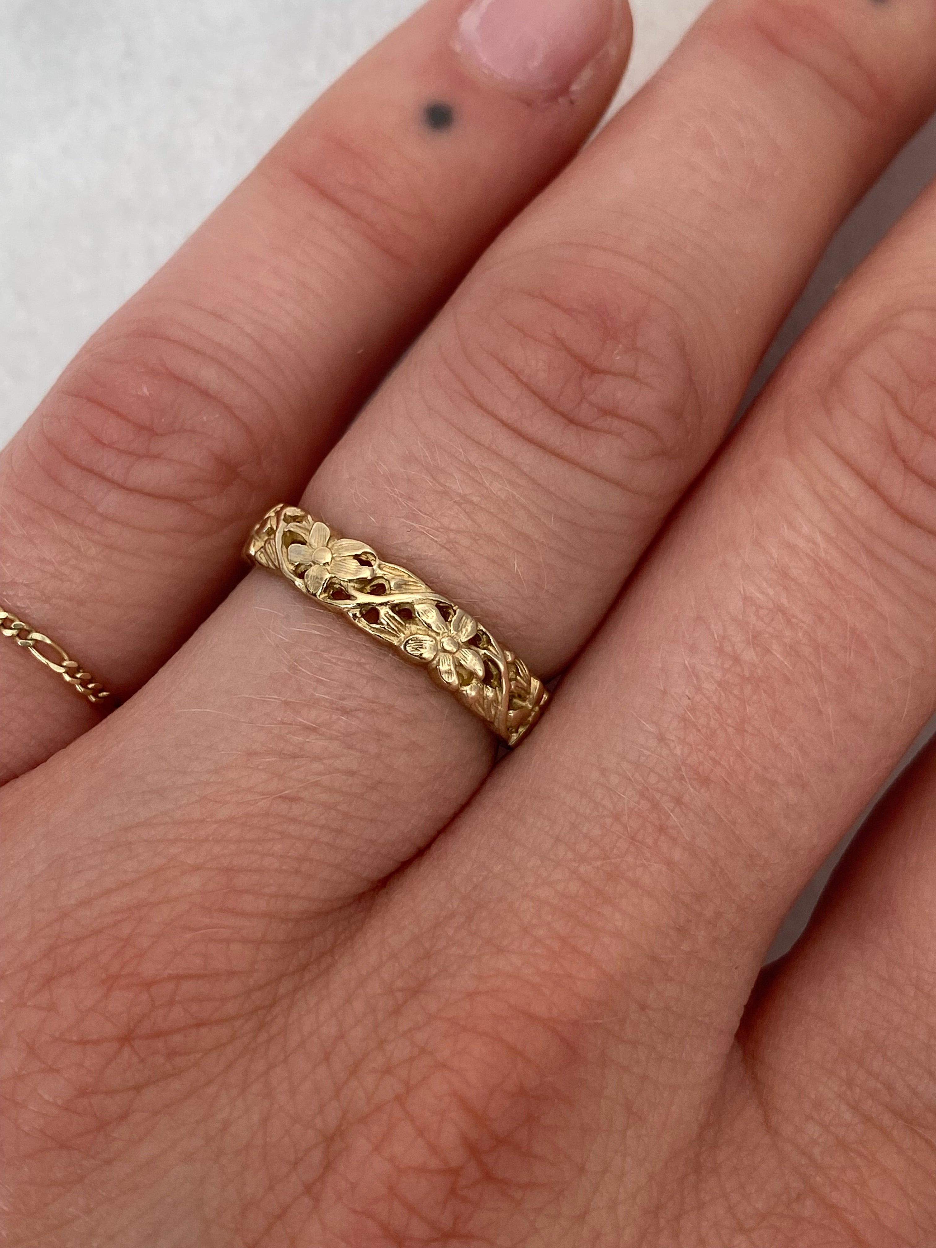 It's all in the details with the Garden Party Band. Filigree flowers and vines intertwine in a band of recycled 14k gold. The Garden Party is made to order in any size.