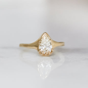 The Gumdrop Ring features a pear diamond in a melty, solitaire setting. The diamond is hugged by a partial bezel and five prongs, giving this ring style and security. Made to order in any size from reclaimed 14k gold. Contact us for sizing inquiries.