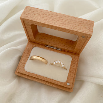 Our signature ring boxes are handcrafted, using timber sourced from sustainable forests and harvested to ensure the biodiversity of the surrounding area is maintained. Each box is finished with a natural satin wax and lined with a velvet pad to keep your jewelry safe and secure.
