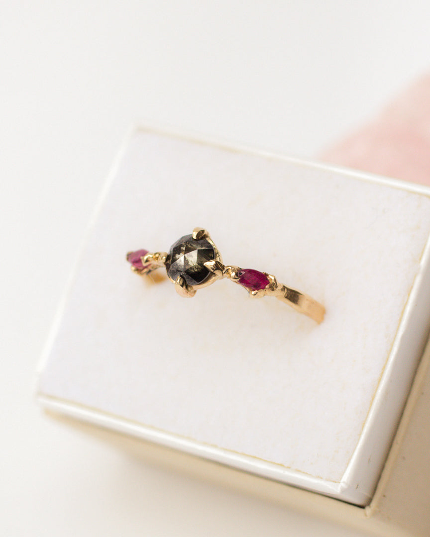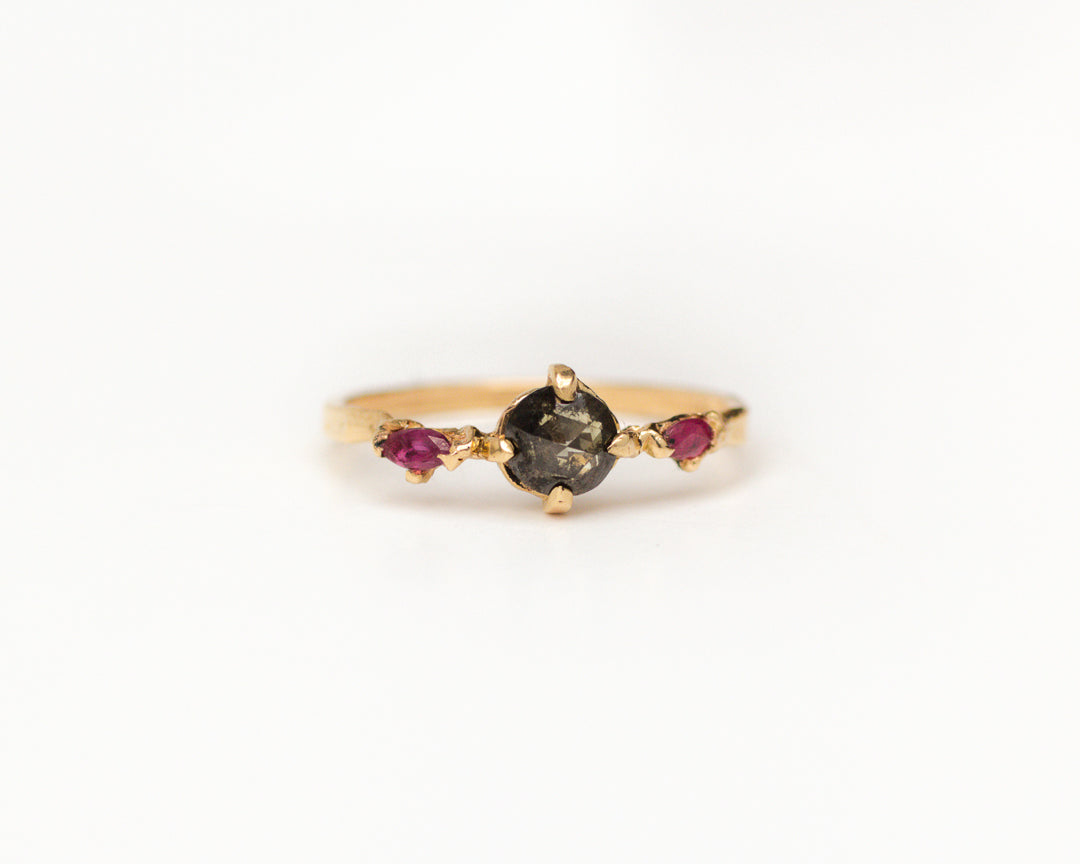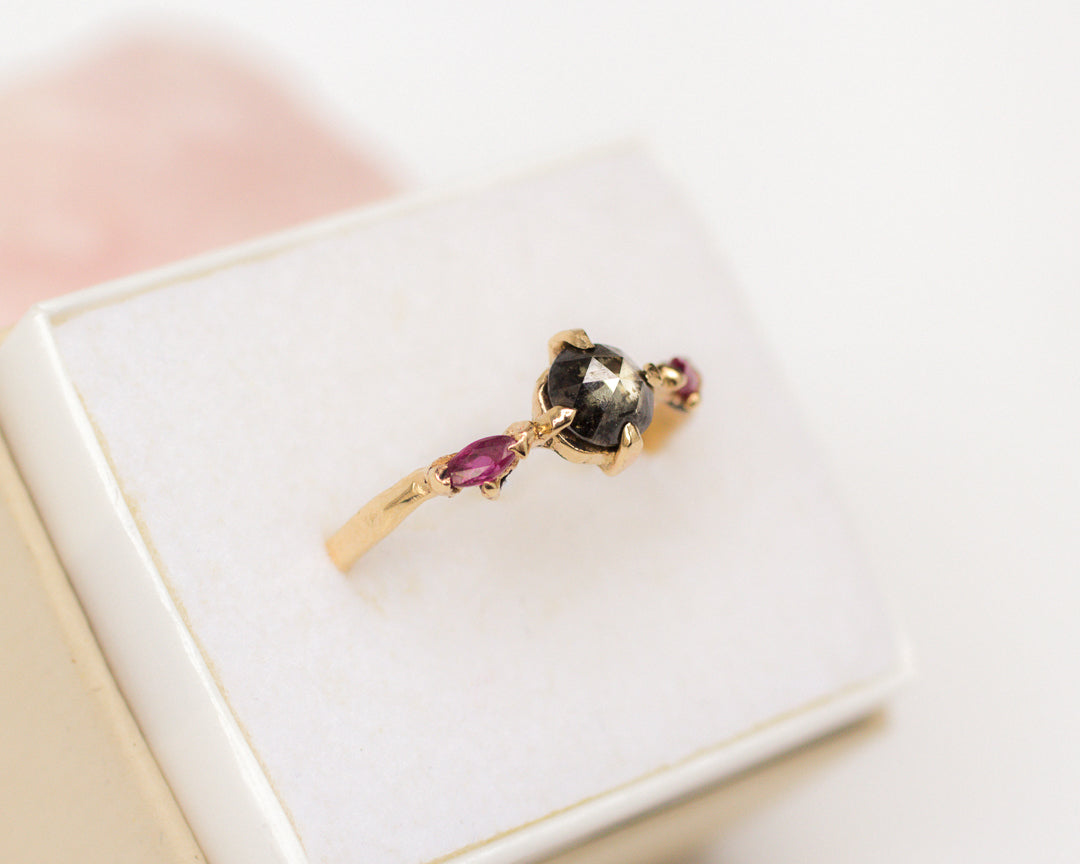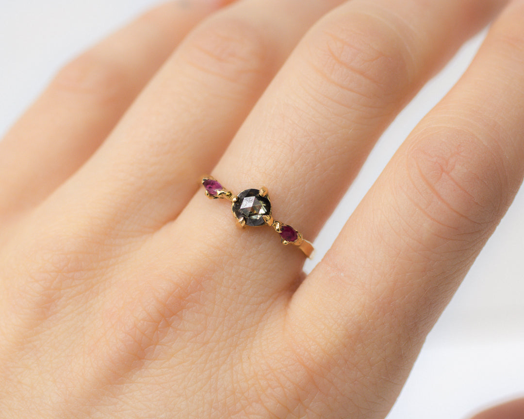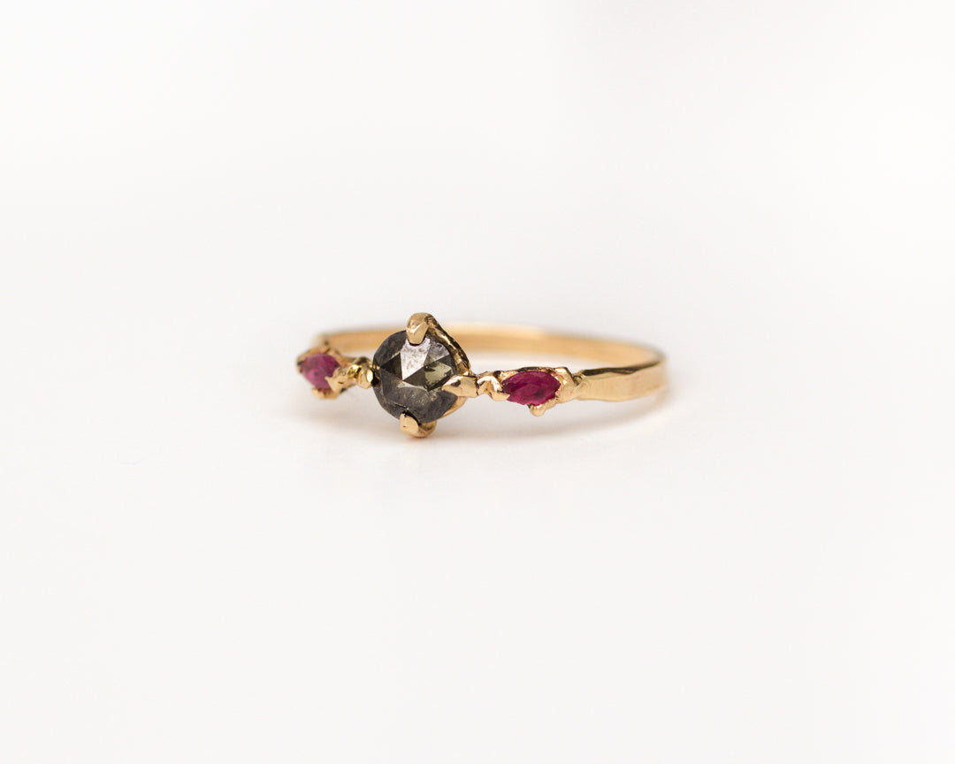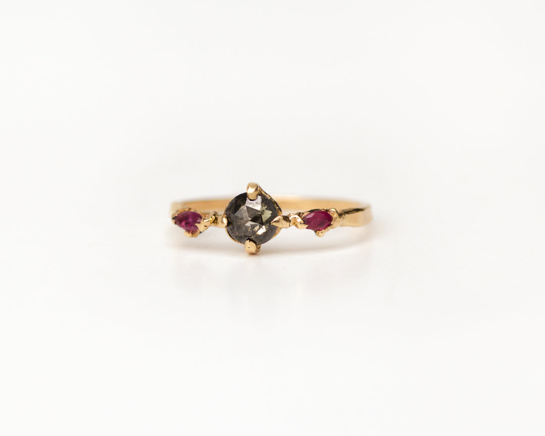 Materials & Measurements: Ethically sourced, .58ct rose cut Australian salt & pepper diamond (5.54mmx5.36mmx2.37mm). Two reclaimed, rose cut rubies. Recycled 14k gold.
