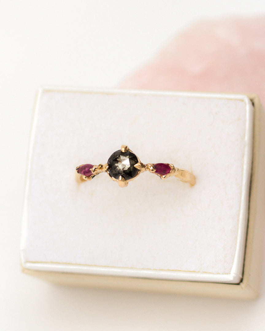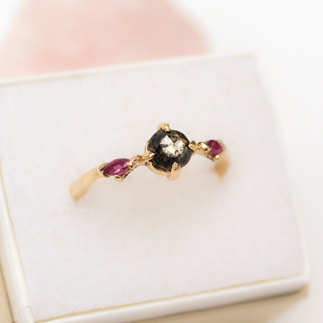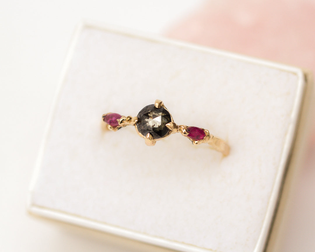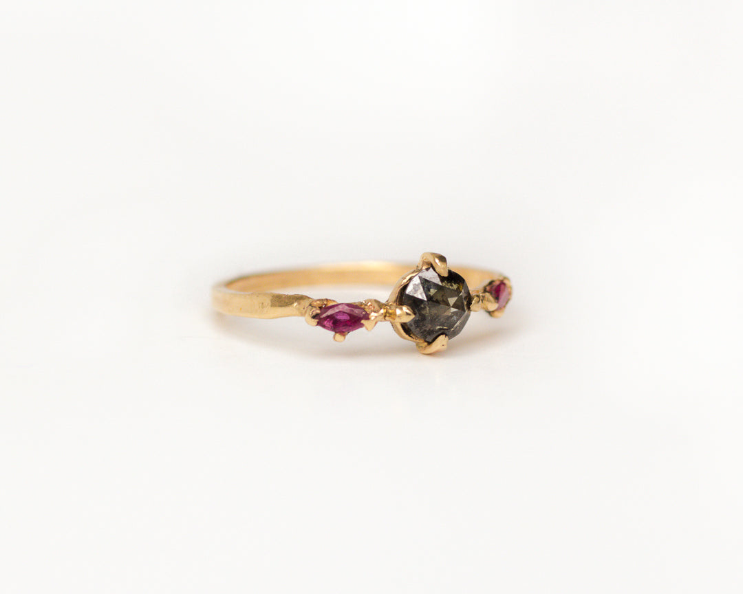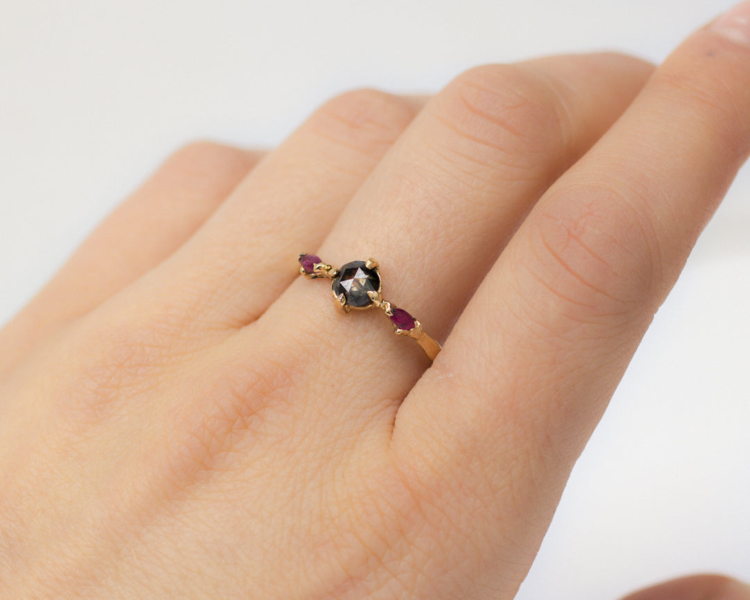 Materials & Measurements: Ethically sourced, .58ct rose cut Australian salt & pepper diamond (5.54mmx5.36mmx2.37mm). Two reclaimed, rose cut rubies. Recycled 14k gold.