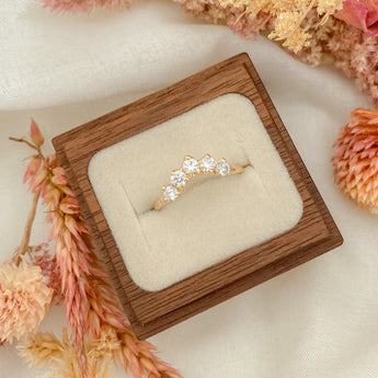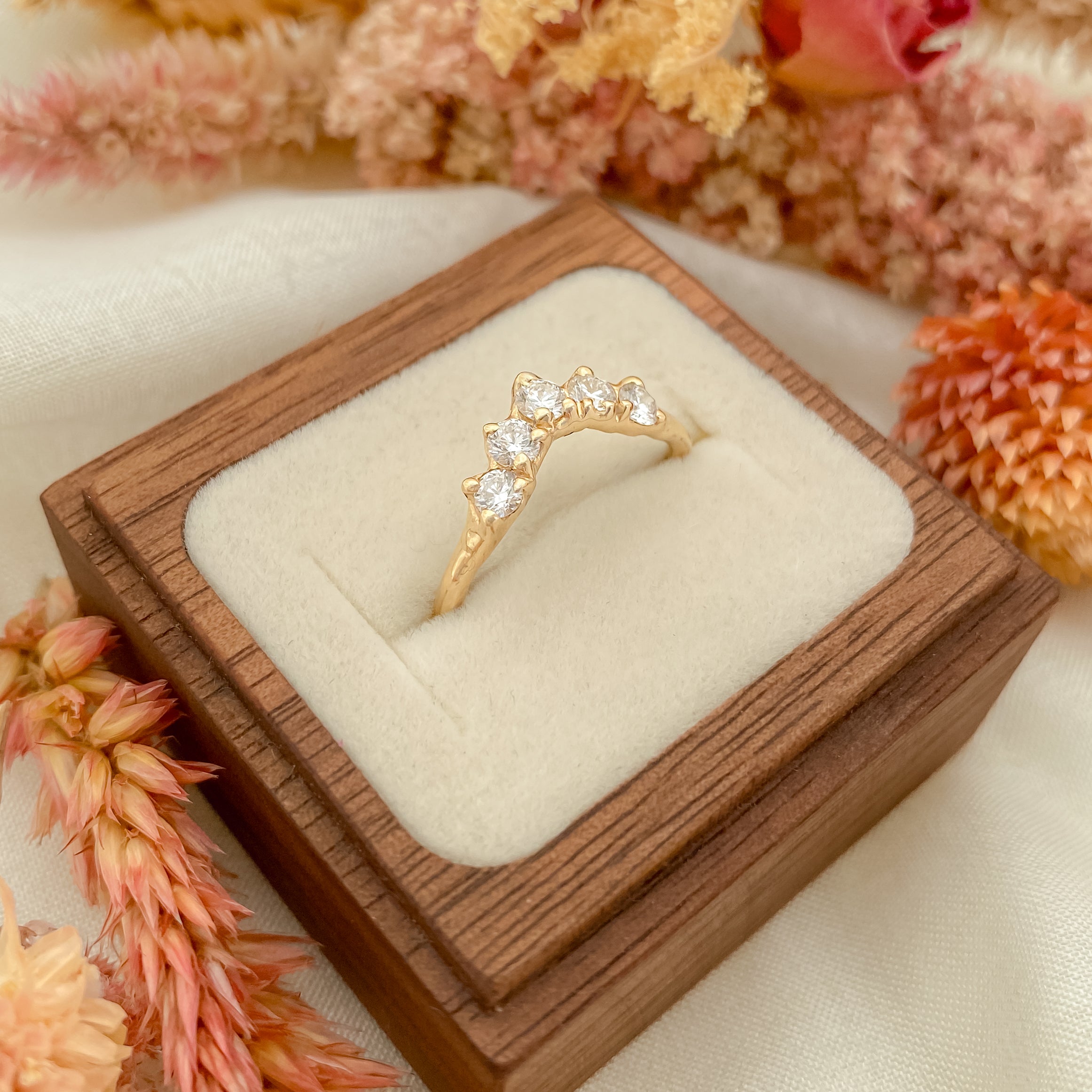 Five ethical white diamonds set in a curved band of reclaimed 14k gold. The White Diamond House Half Halo pairs well with round or pear solitaires.