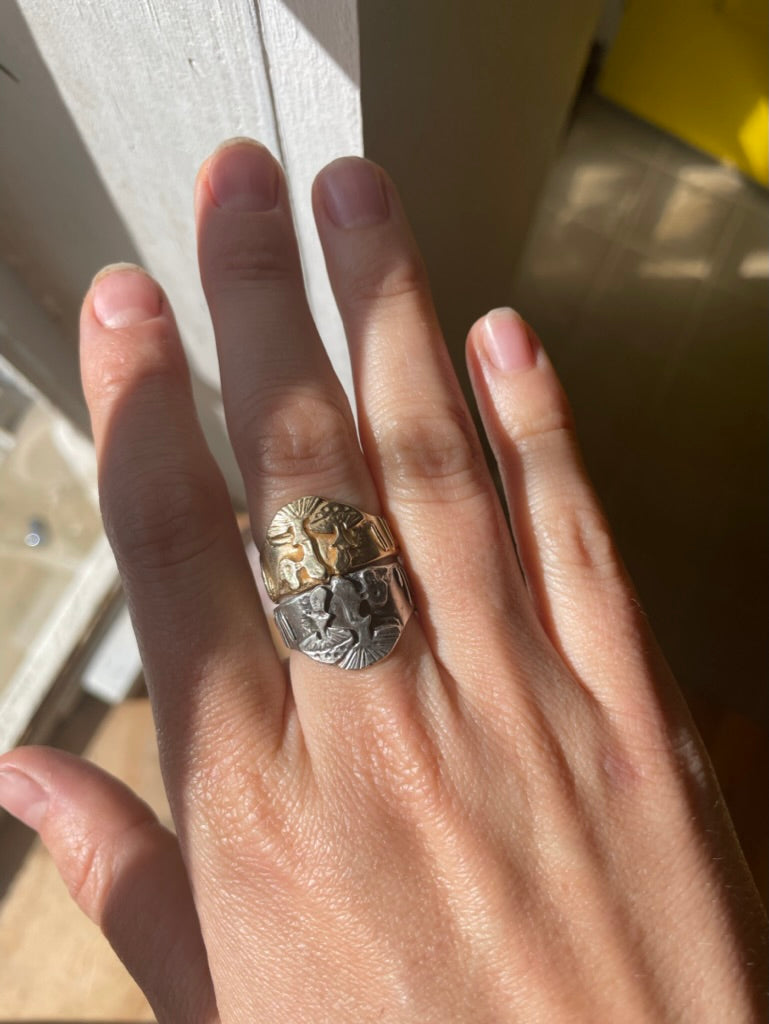 A cluster of Amanita mushrooms rest in a bed of grass, surrounded by friendly garden friends. Made to order in any size, the Amanita Ring is crafted from reclaimed sterling silver. Also available in 14k gold.