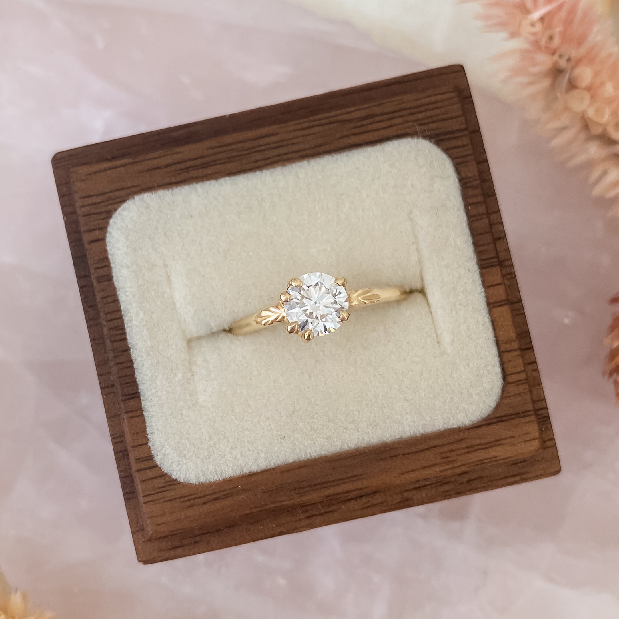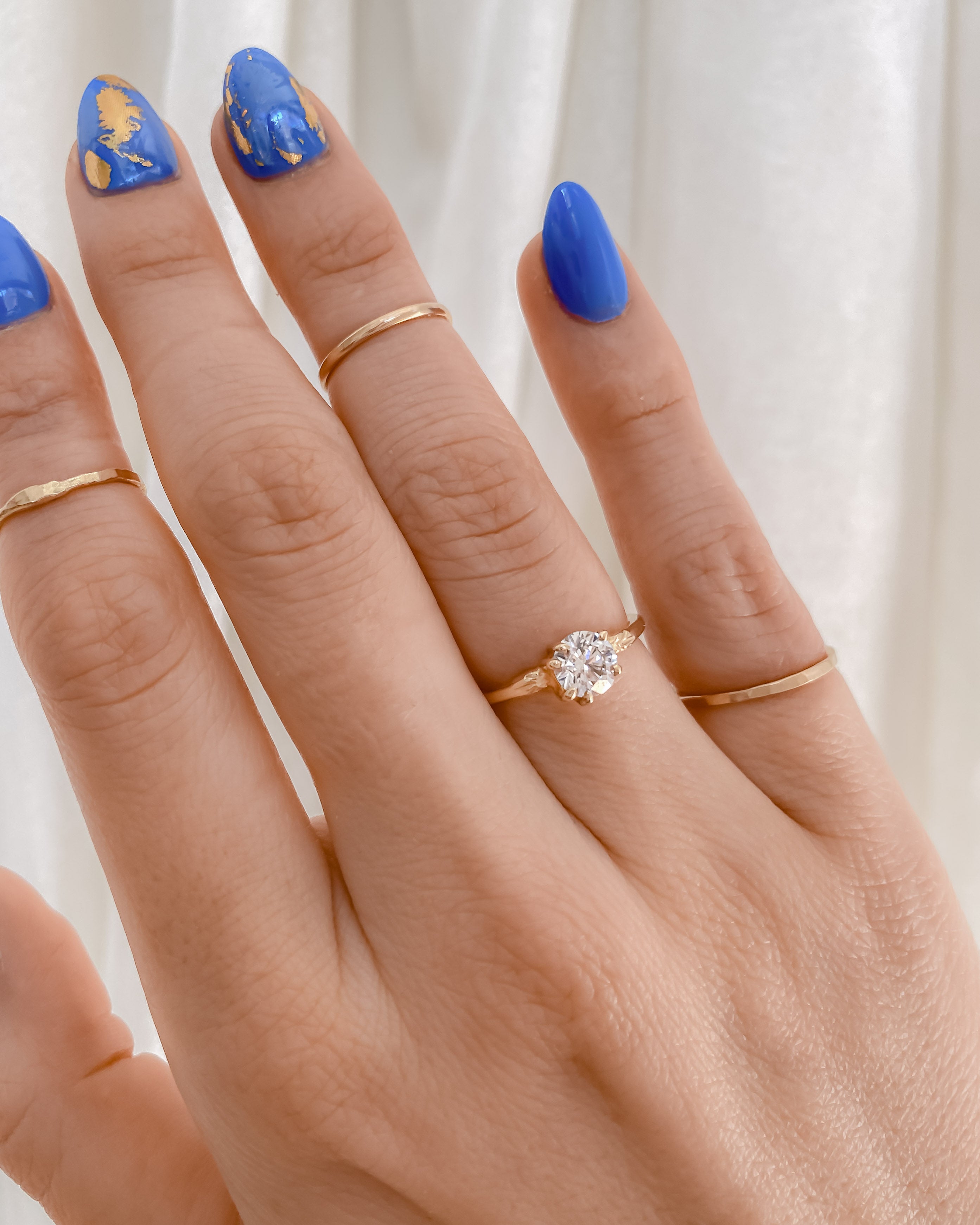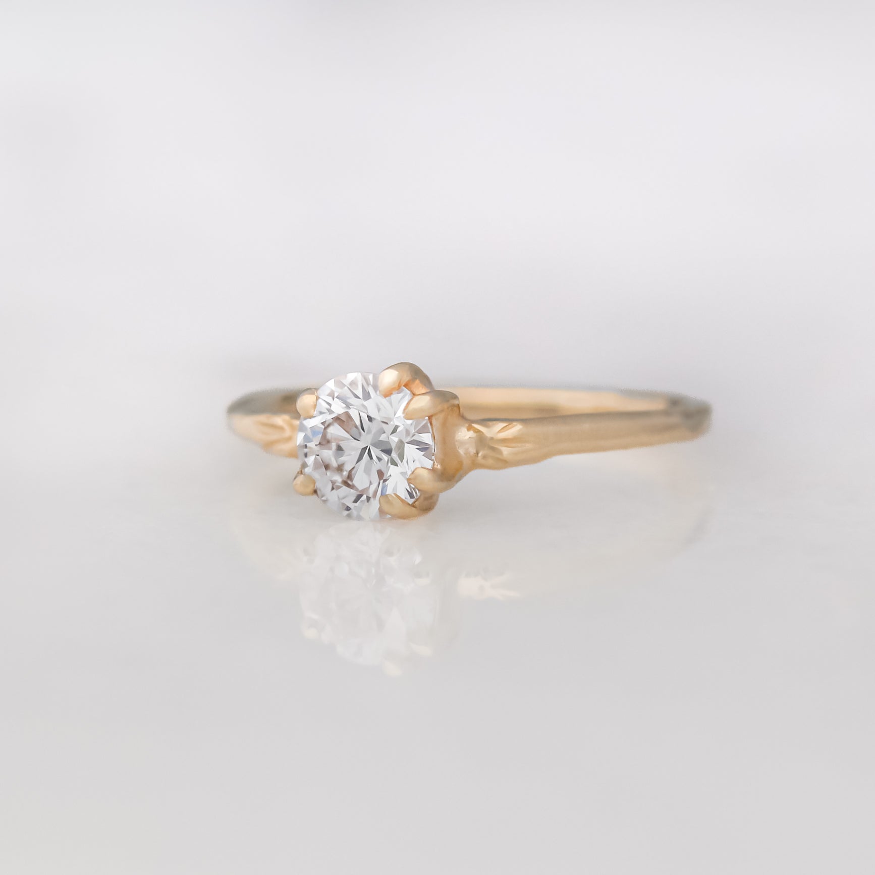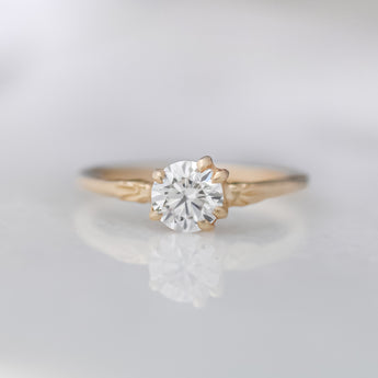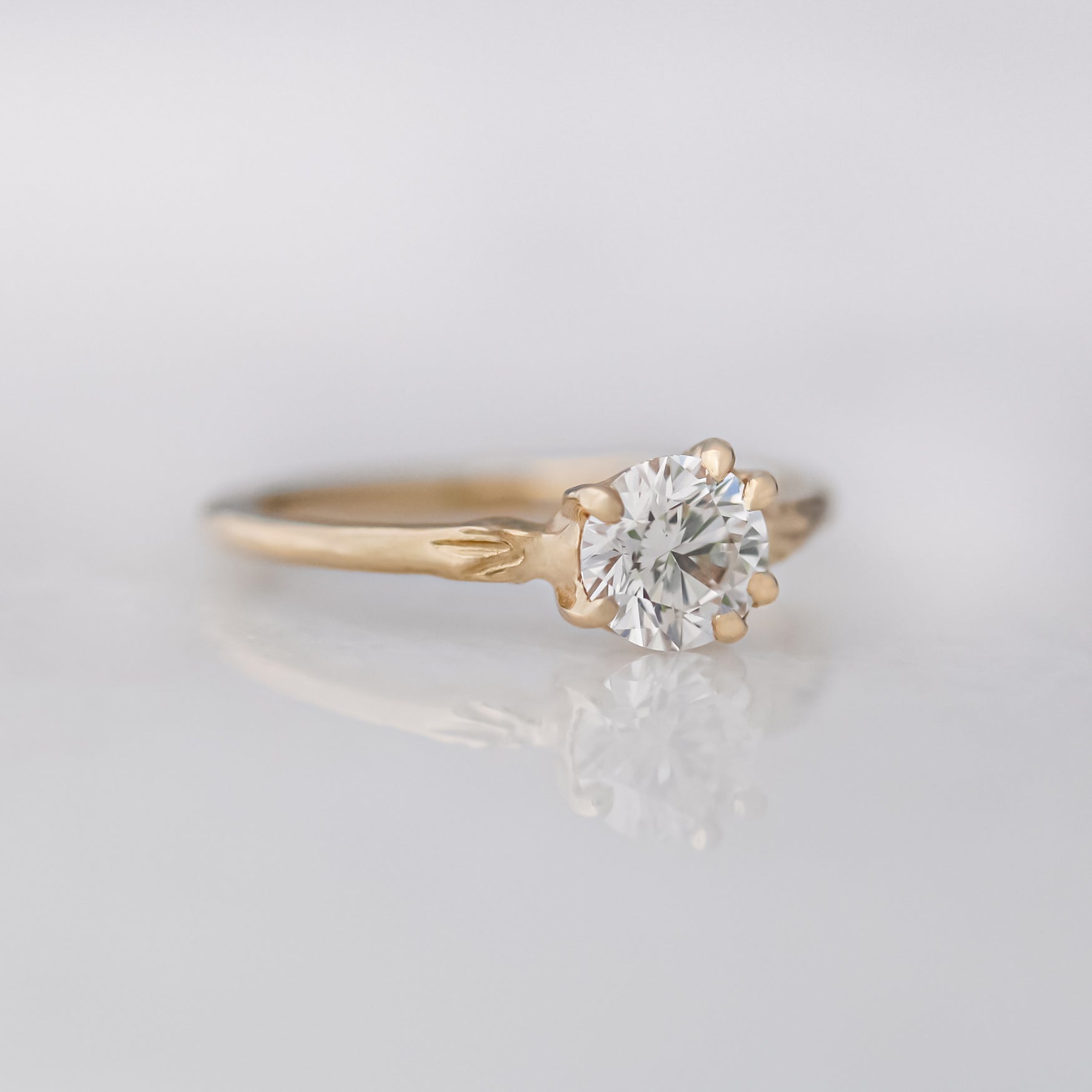The Classic Pi, a timeless round solitaire with a twist. Asymmetrical prongs create a unique feel on this heirloom-in-the-making. Crafted from reclaimed 14k gold and set with an ethical, lab diamond. The Classic Pi is the perfect solitaire.