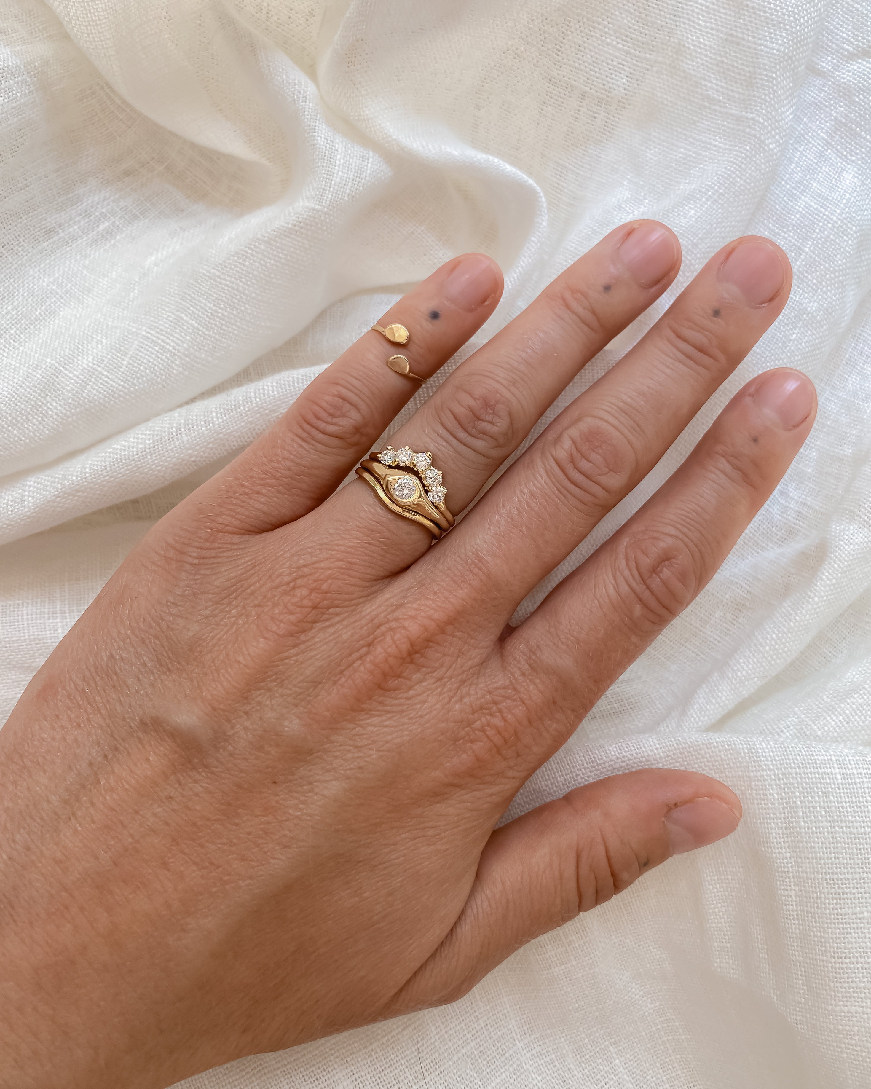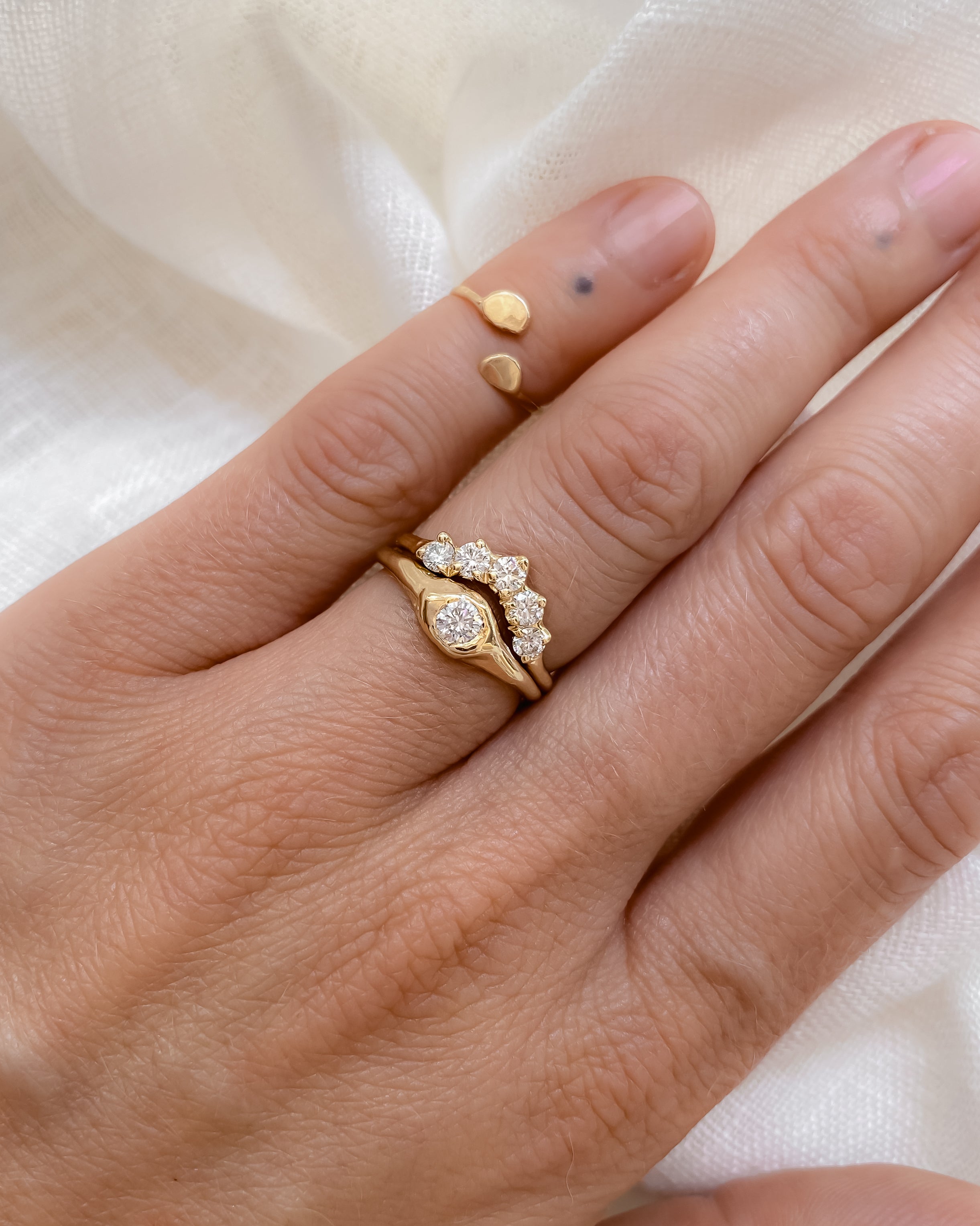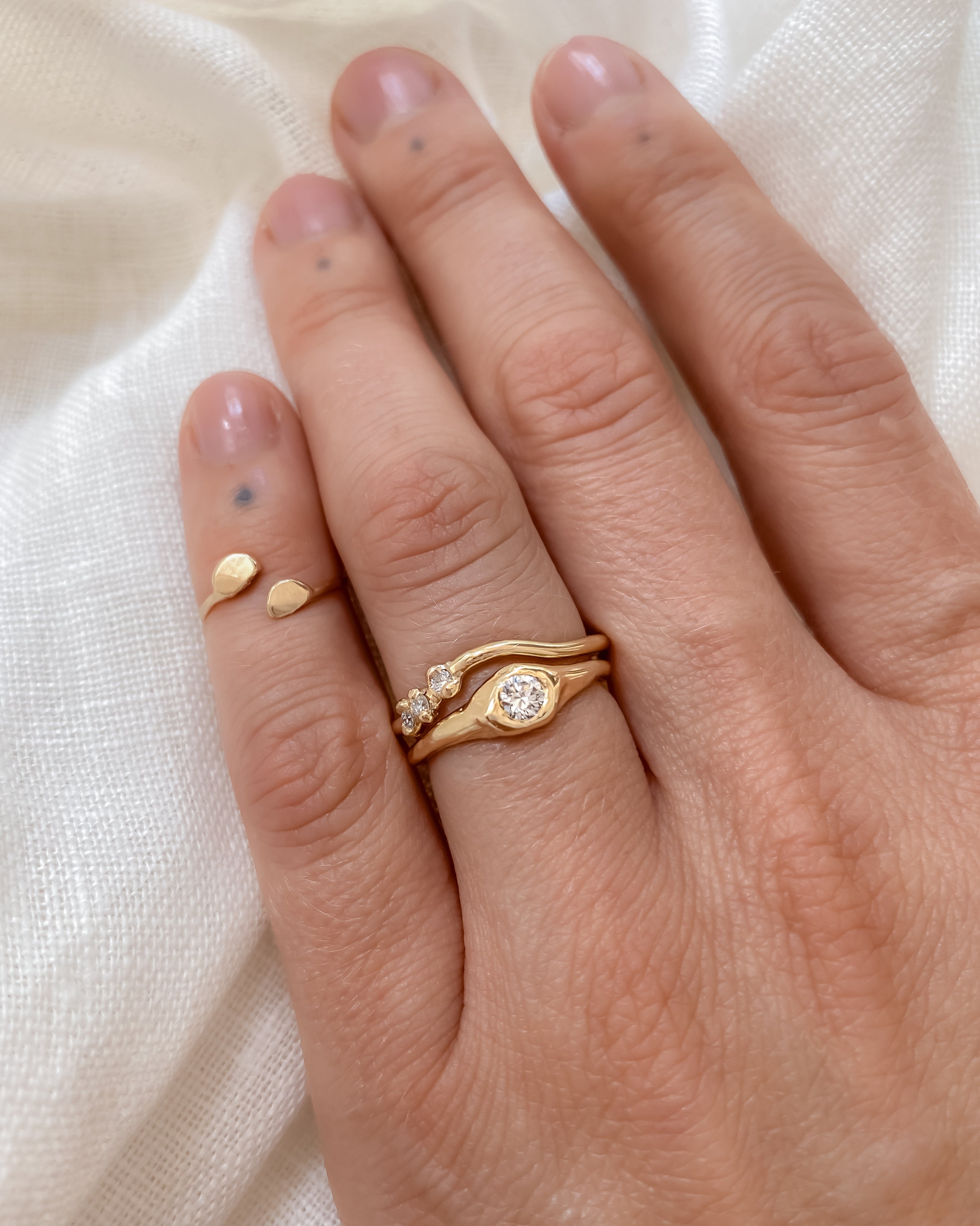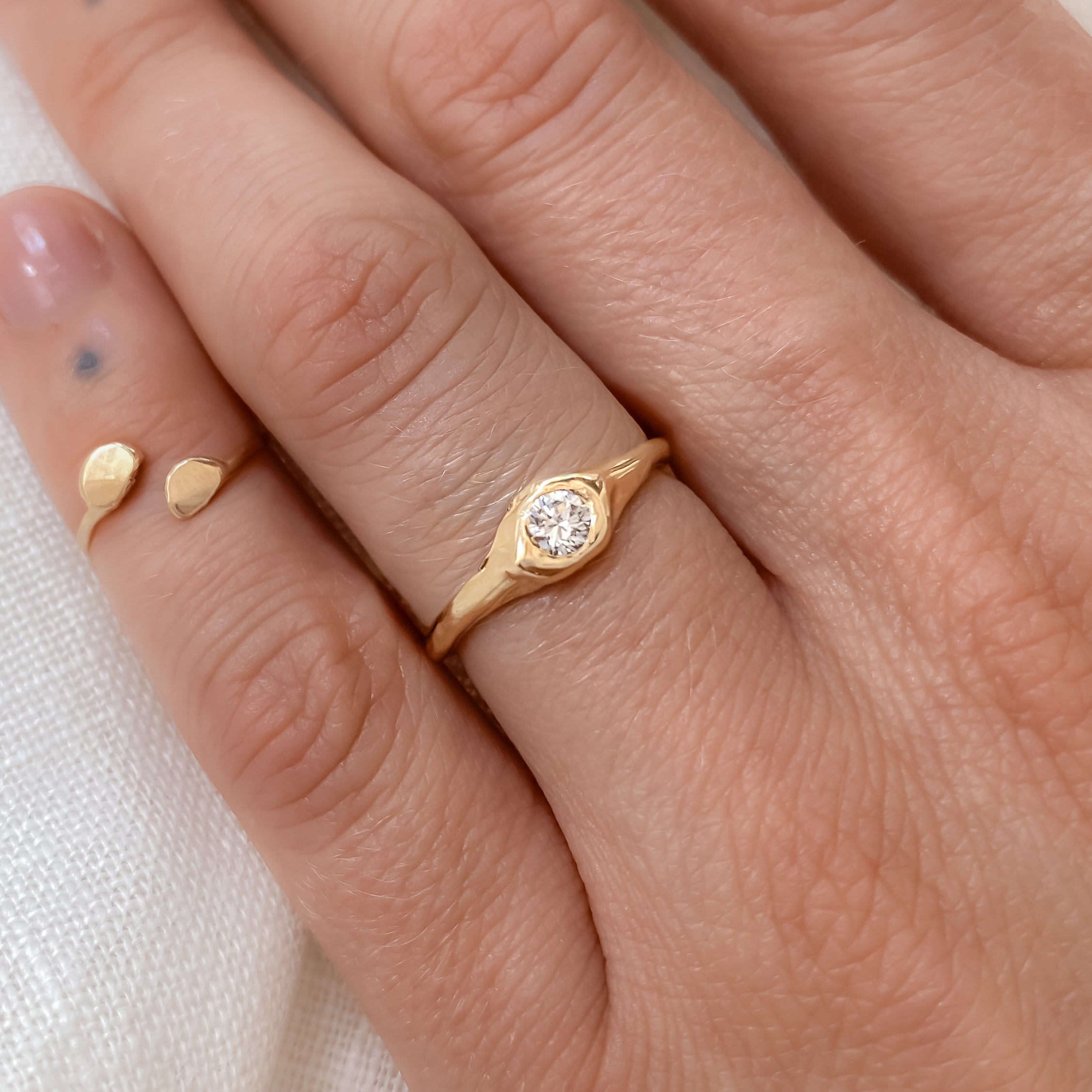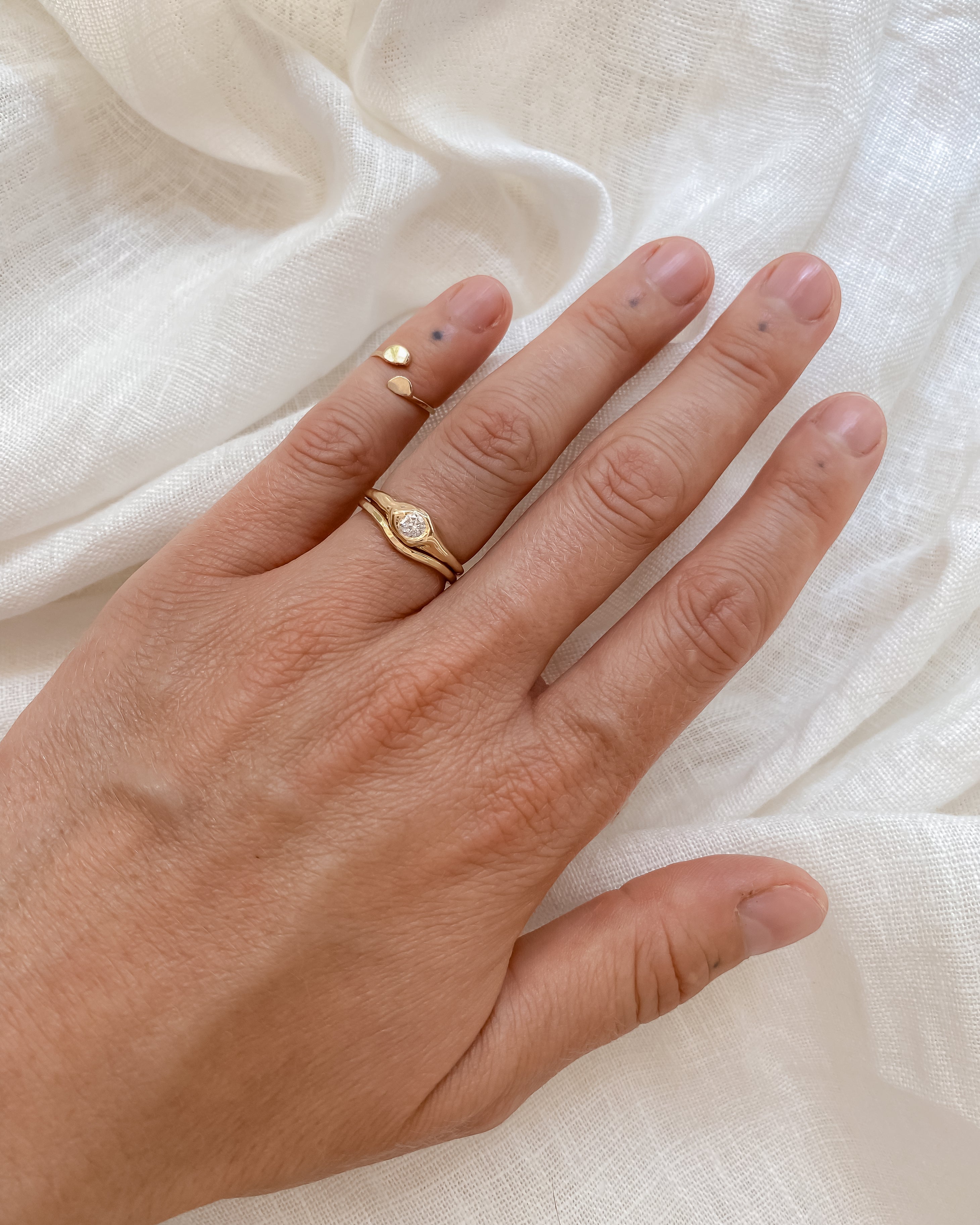 Featuring a stunning white diamond set in a band of recycled 14k gold. This item is made to order in any size.