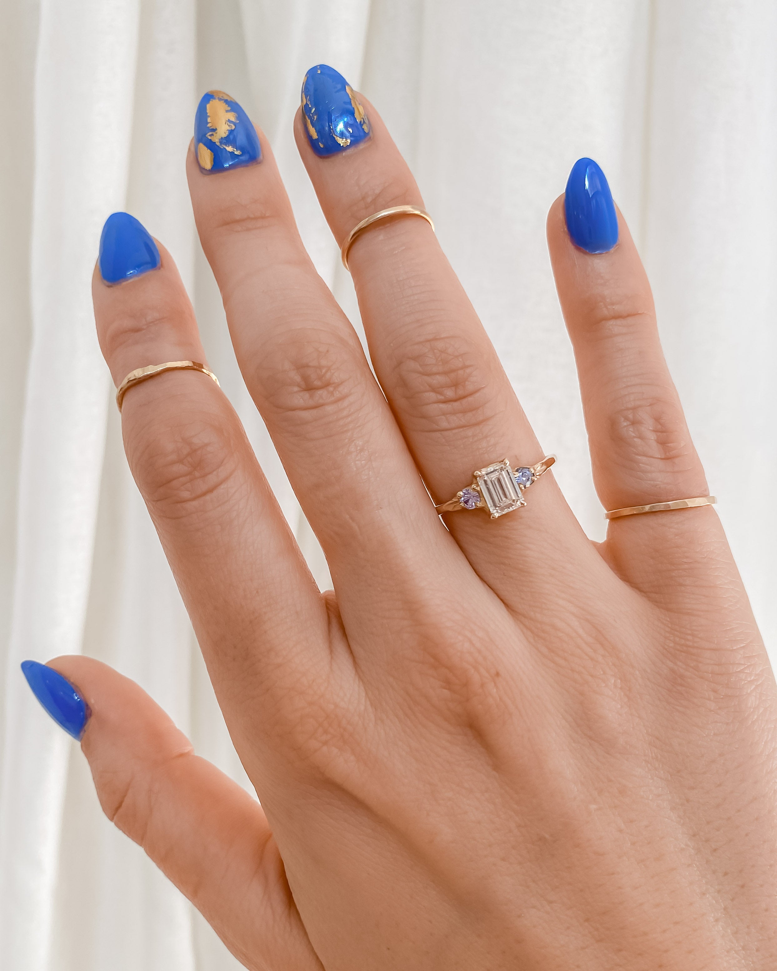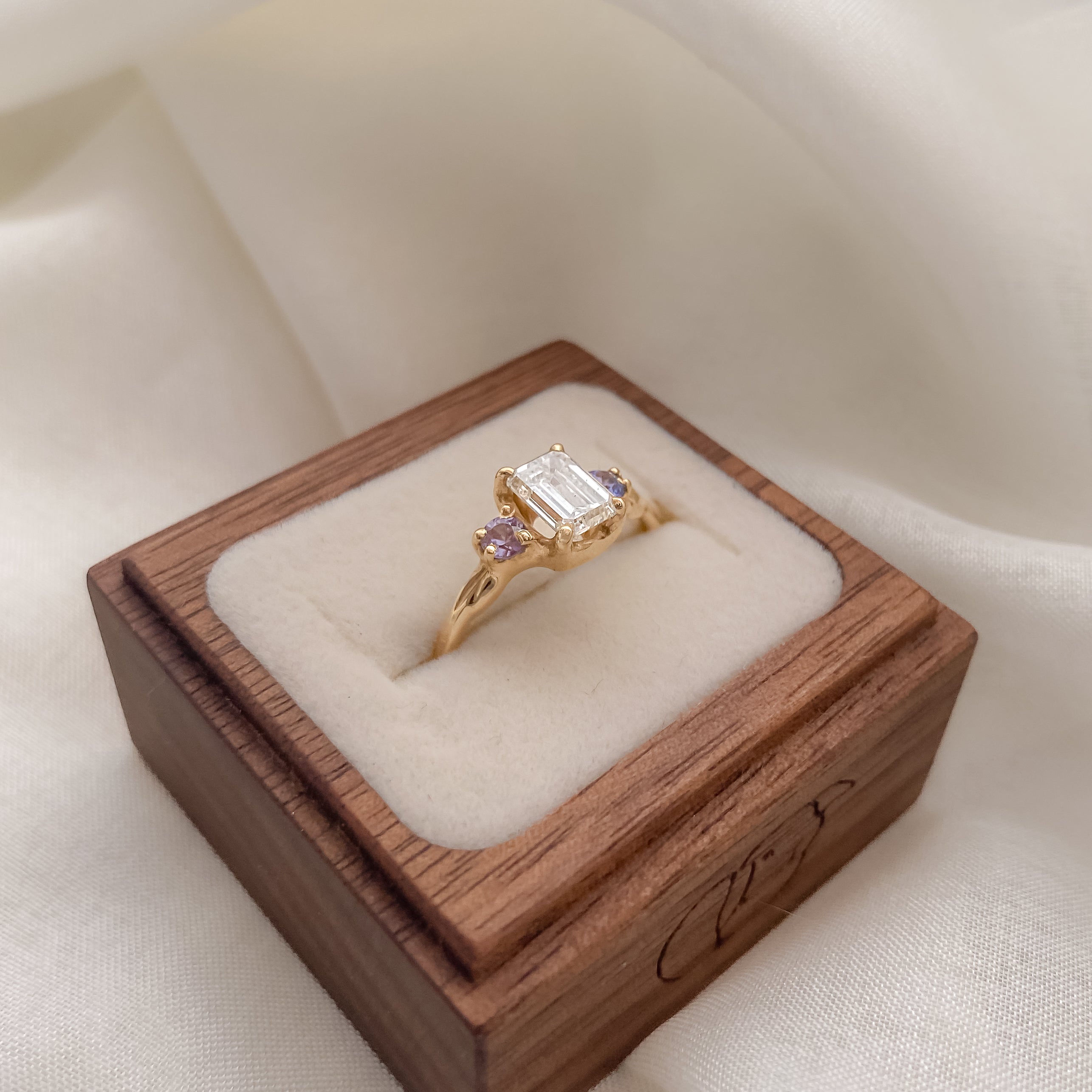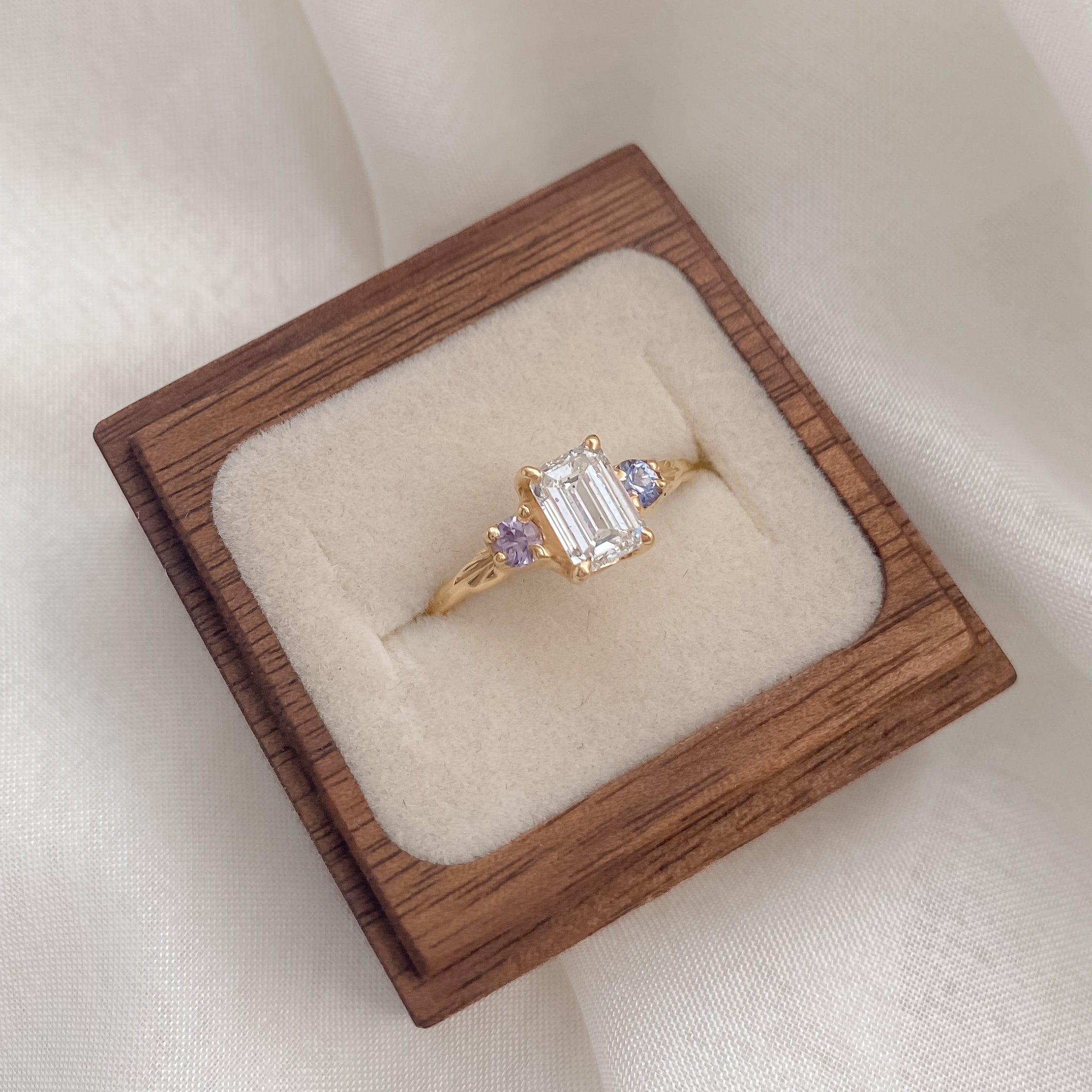 The Emerald City, our house trilogy, now available with speciality stones. Sapphires of lavender and indigo frame a stunning, 1ct white diamond. Crafted from reclaimed 14k gold and ethically sourced stones.