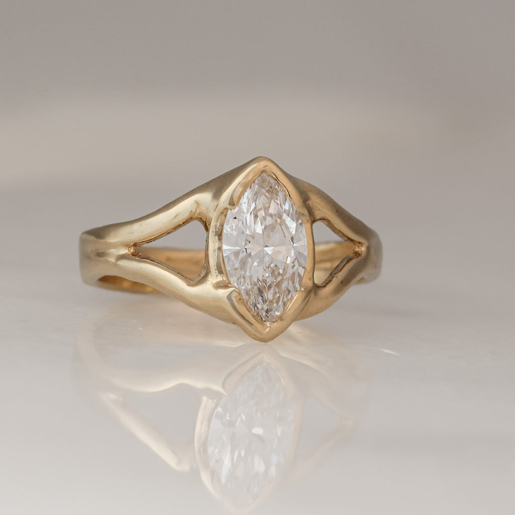 The Eve Ring provides the perfect combination of organic and timeless elements. A partial-bezel setting securely holds the diamond while the split shank adds interest to this classic solitaire design.