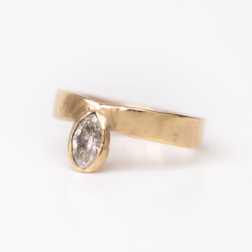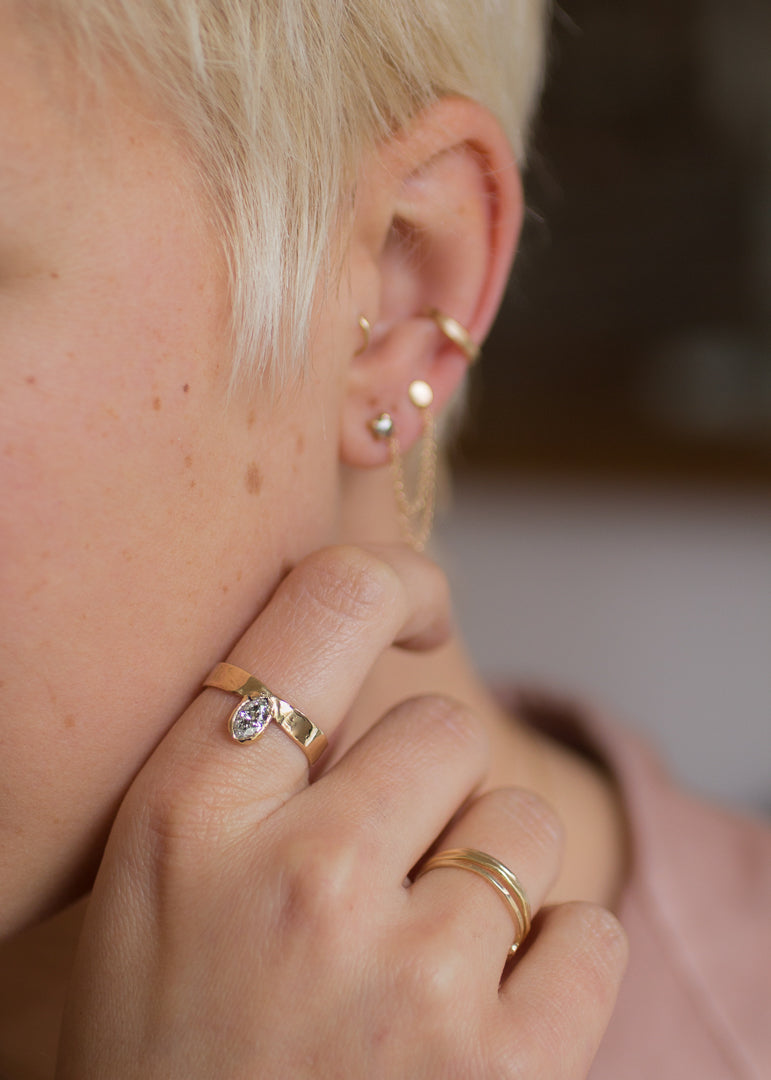A reclaimed diamond, set in a band of 14k gold. Handcrafted with a bezel setting.