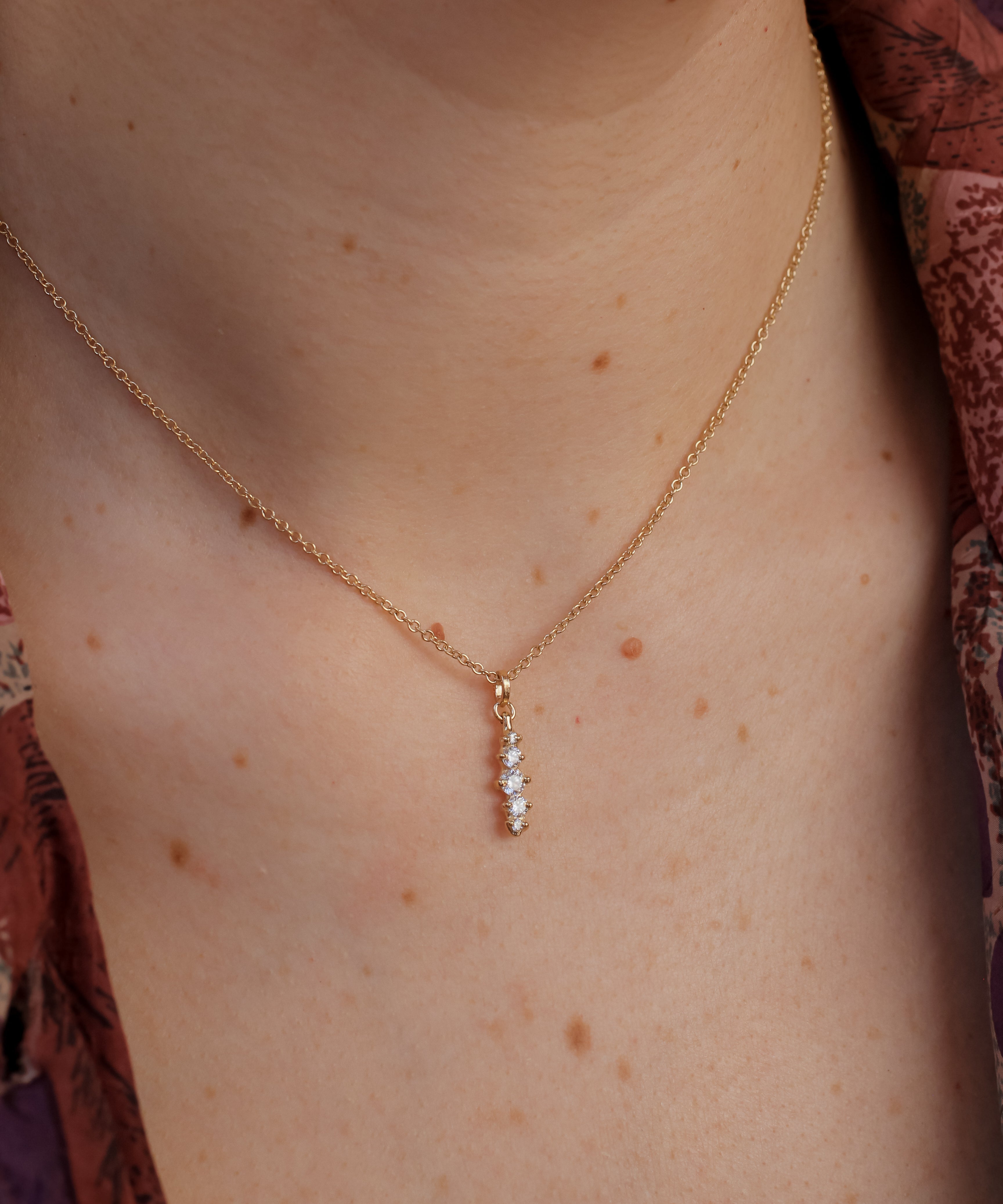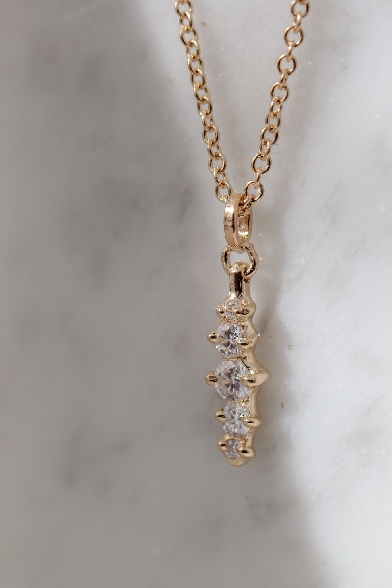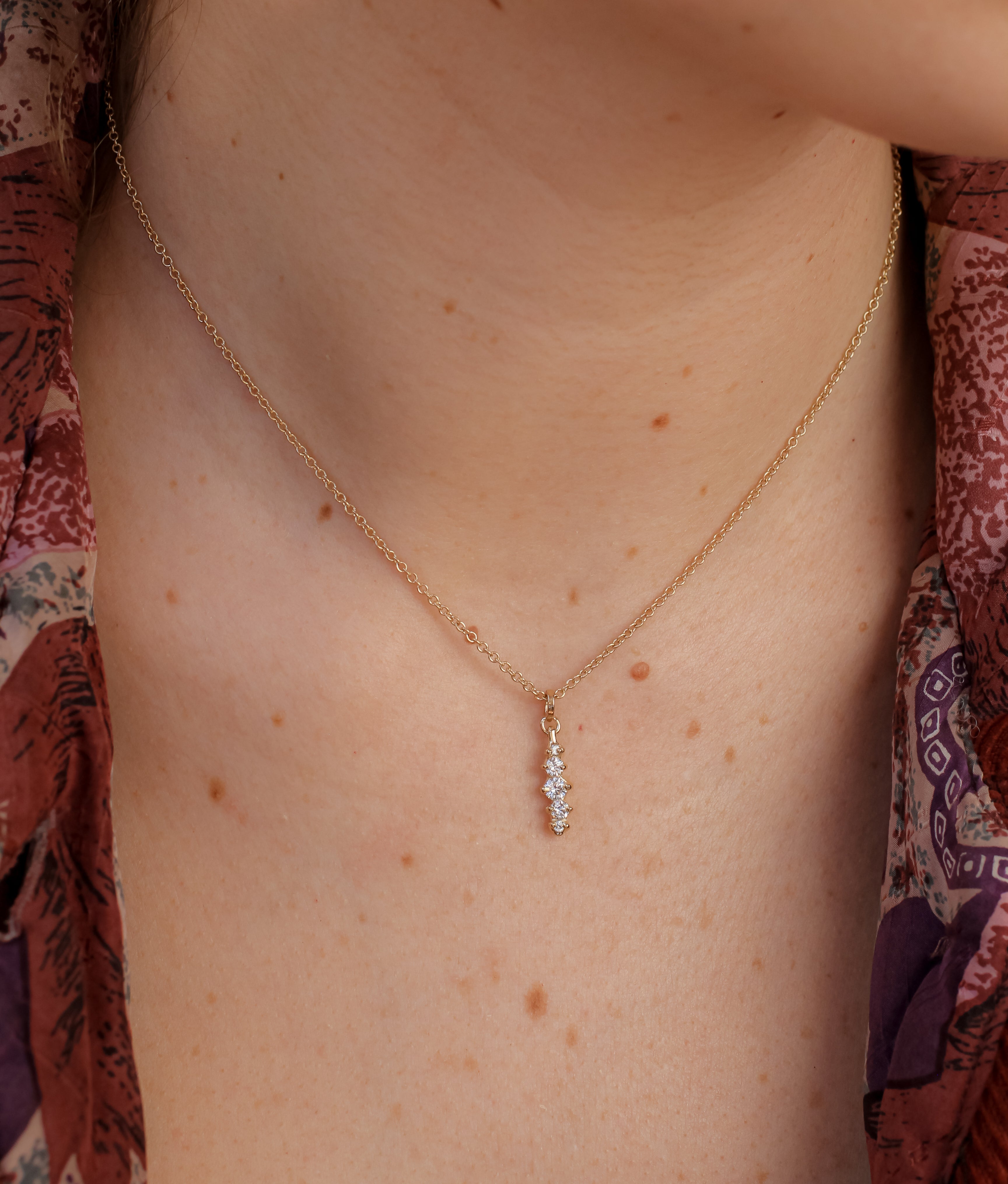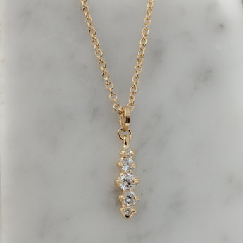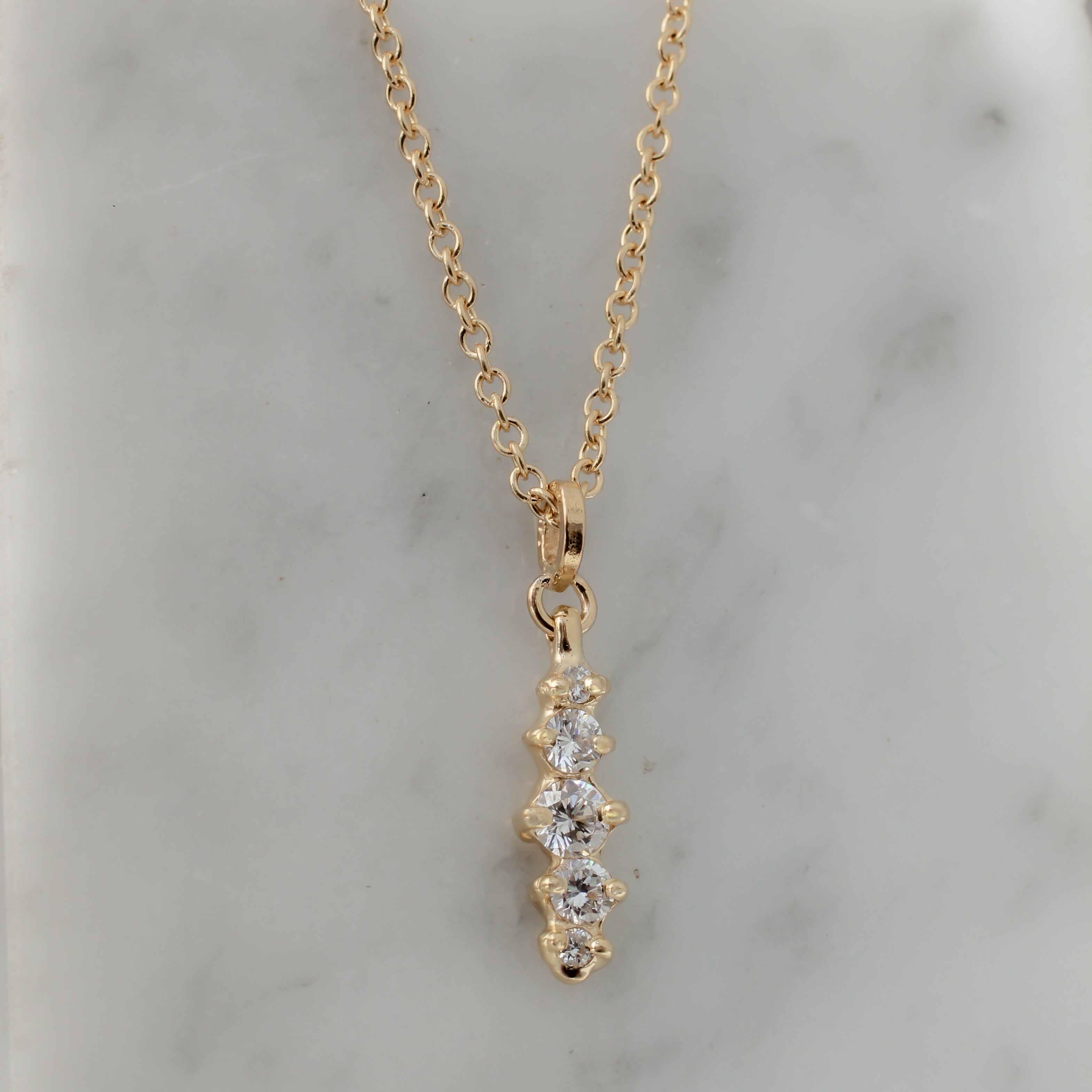 The Meeko Pendant features five lab diamonds set vertically in recycled 14k gold, creating a sleek, elongated silhouette. Suspended from a 1.5mm, 16-inch cable chain.