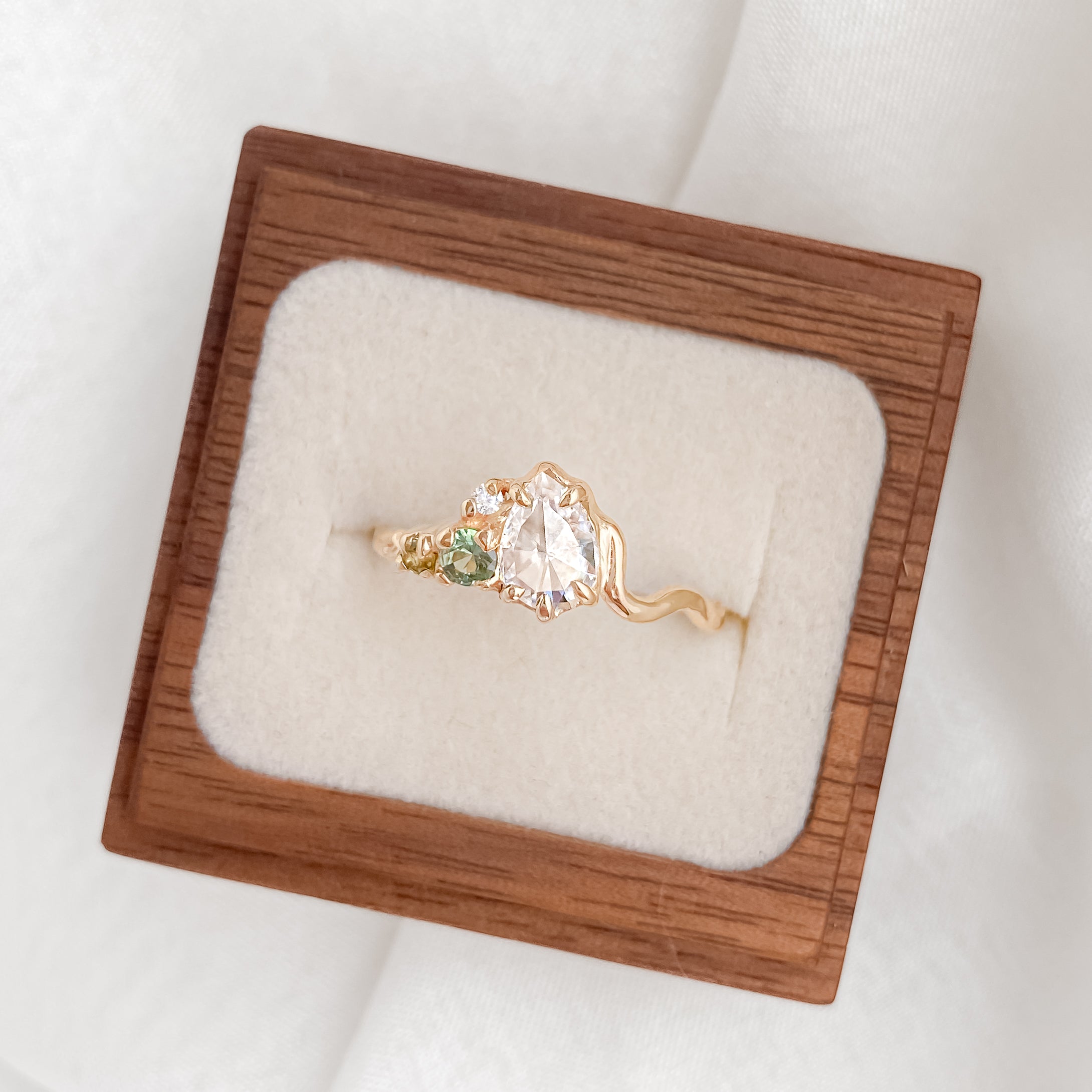Pingo is a geological term referring to earth covered ice hills that form in permafrost. Recycled 14k gold. Lab created Pear Shaped rose cut 5mmx7mm Moissanite with five prongs.