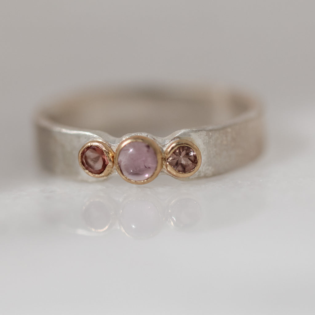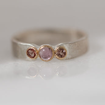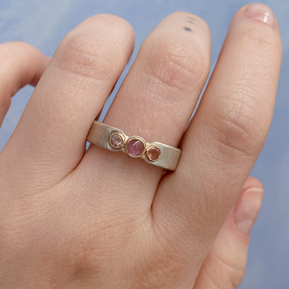 This recycled sterling silver band features one pink tourmaline with two Oregon sunstones bezel set in recycled 14k gold.