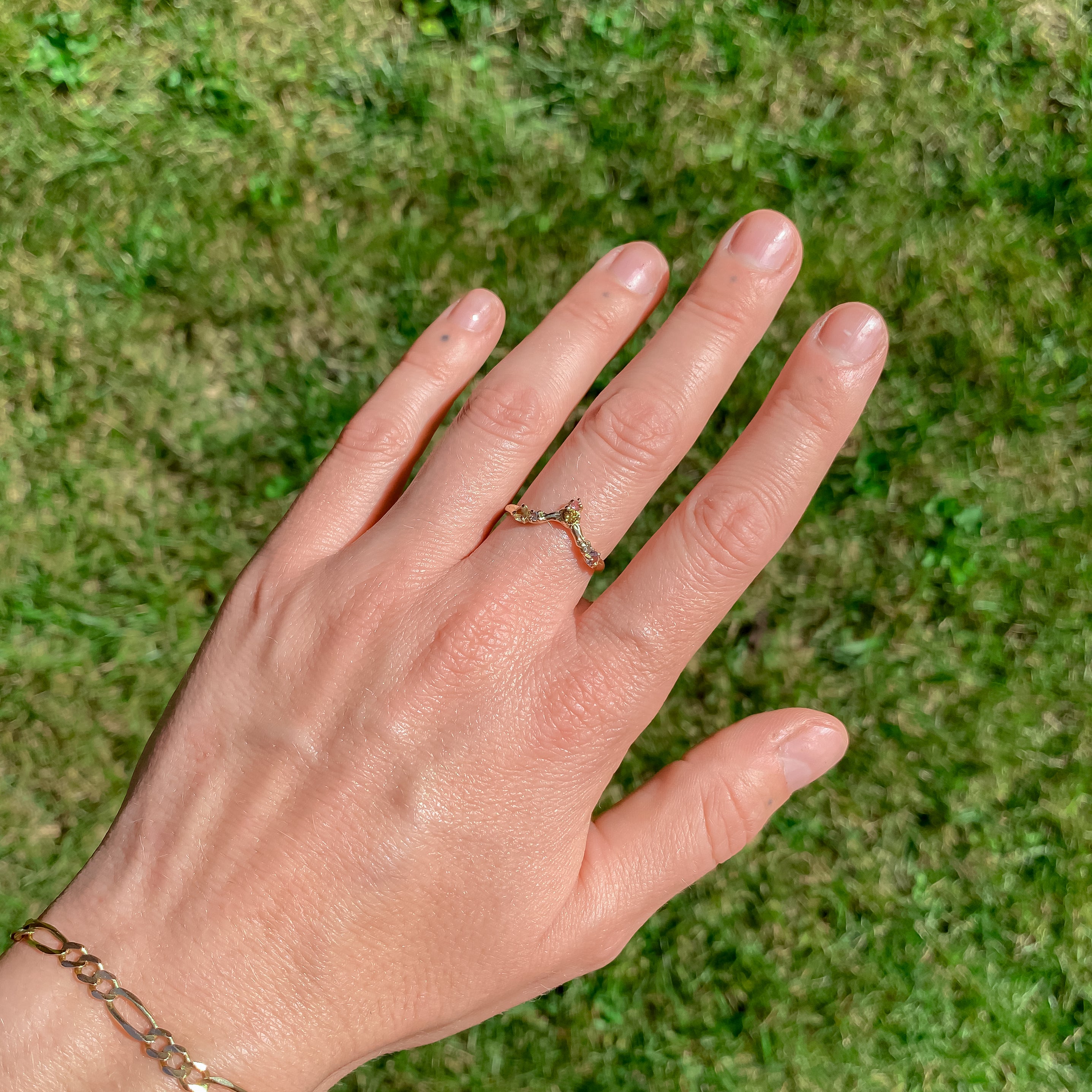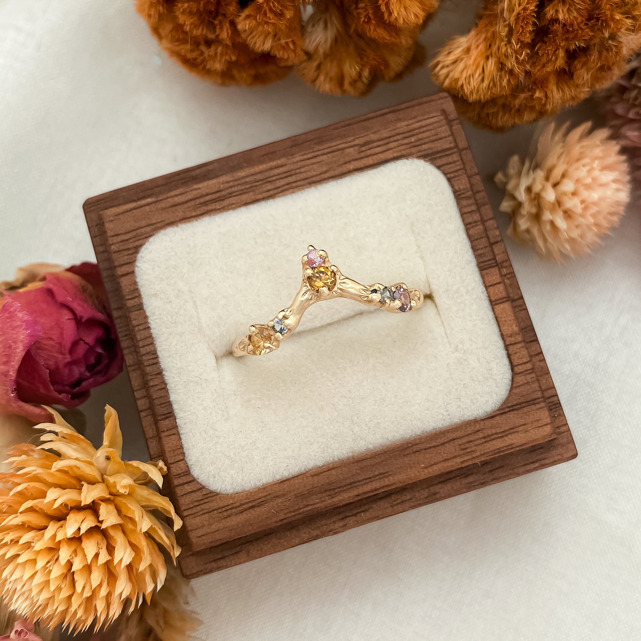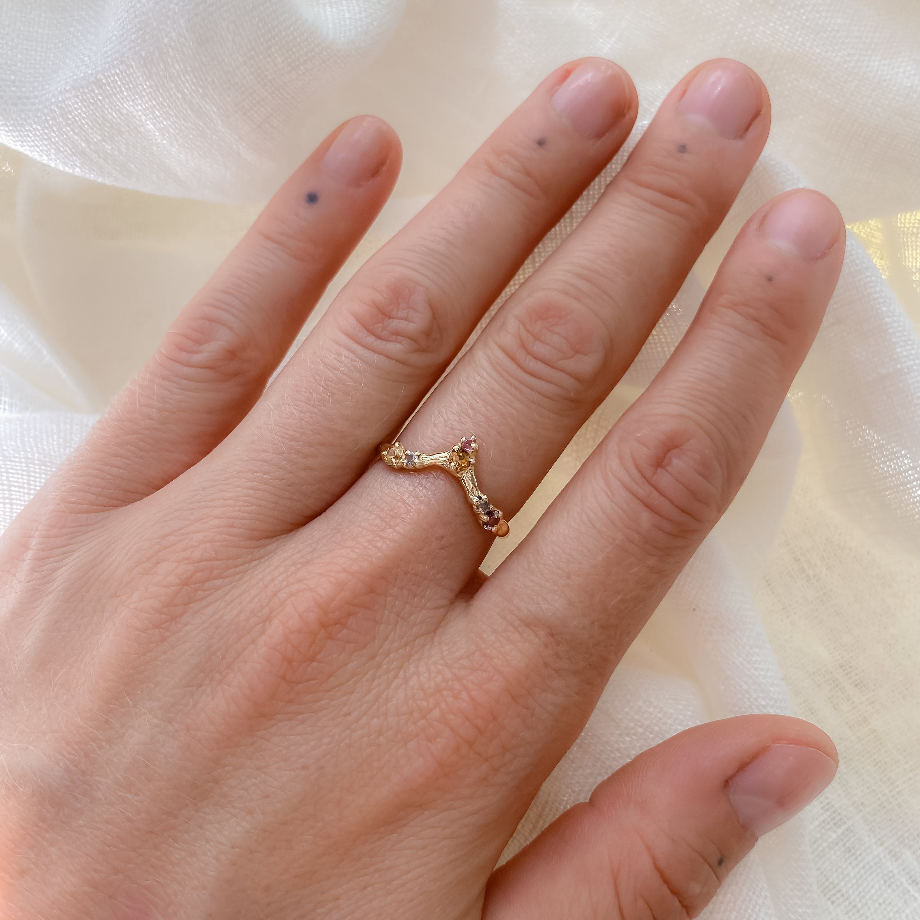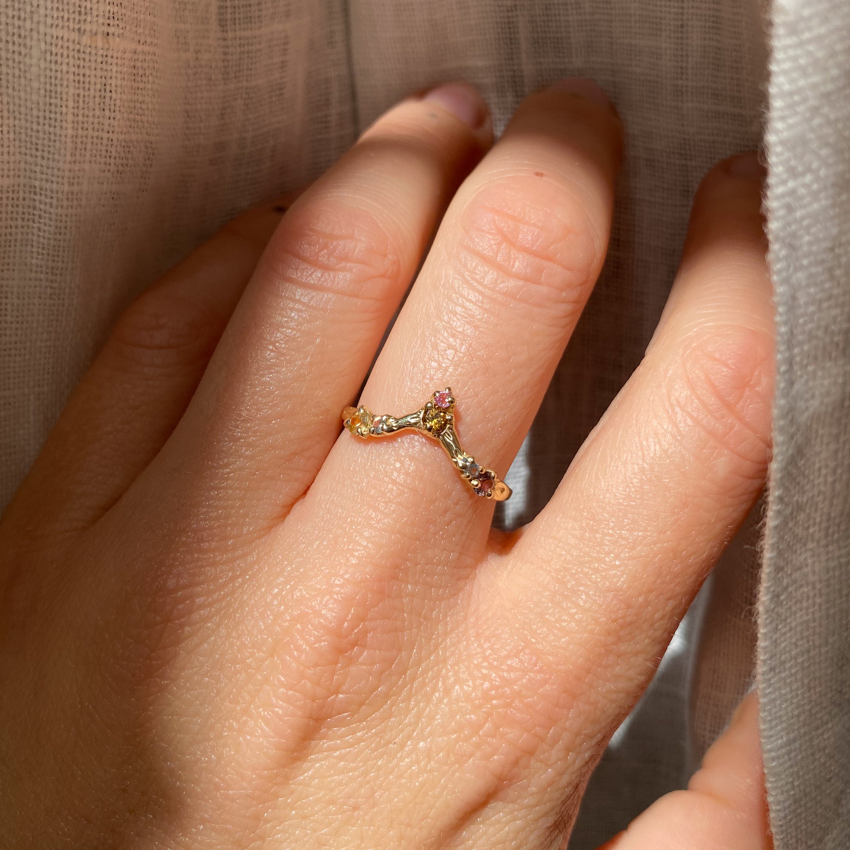 Six rainbow sapphires crown this twinkling ring. Crafted from reclaimed, solid 14k gold. Featuring ethically sourced, Montana sapphires and hand-engraved details.