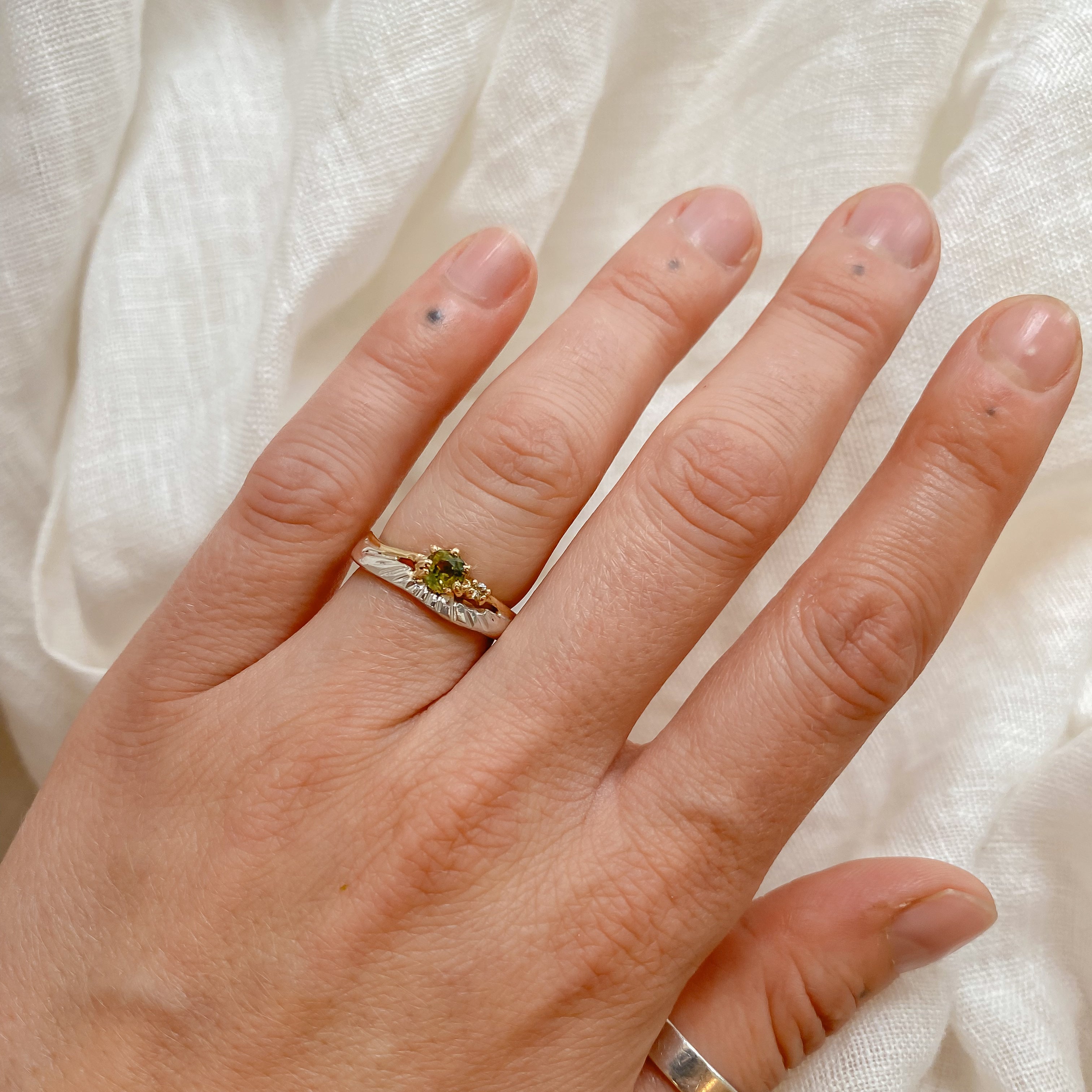 Australian blue-to-green parti sapphire brilliant cut along side a reclaimed, champagne diamond. Nestled in an engraved, recycled sterling silver band and set in 14k gold.