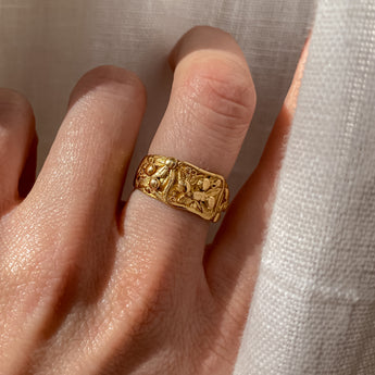 A vintage 22k yellow gold band featuring intricate olive branch imagery. Only one available. Ready to ship in size 8.25. This item is not eligible for resizing.